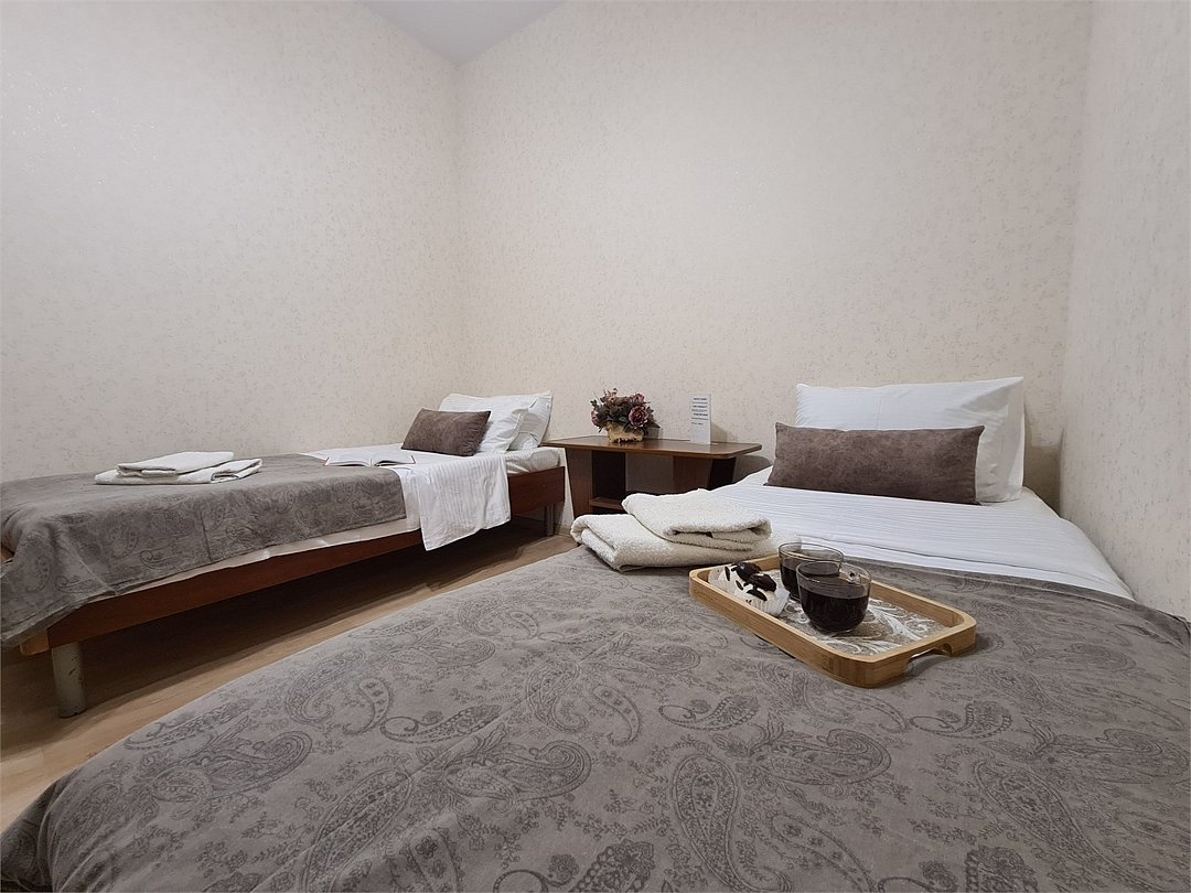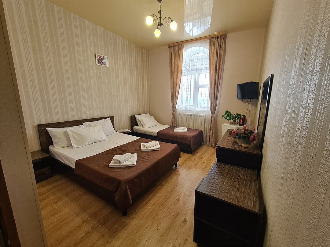 Двухкомнатный семейный номер. В одной комнате две односпальные кровати. Во второй двуспальная кровать и односпальная. Кондиционер и тв в каждой комнате. Душ и туалет в номере. Взимается залог в размере 2000рУслуги и удобства