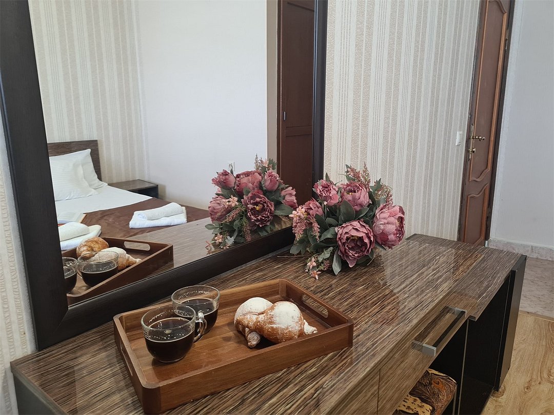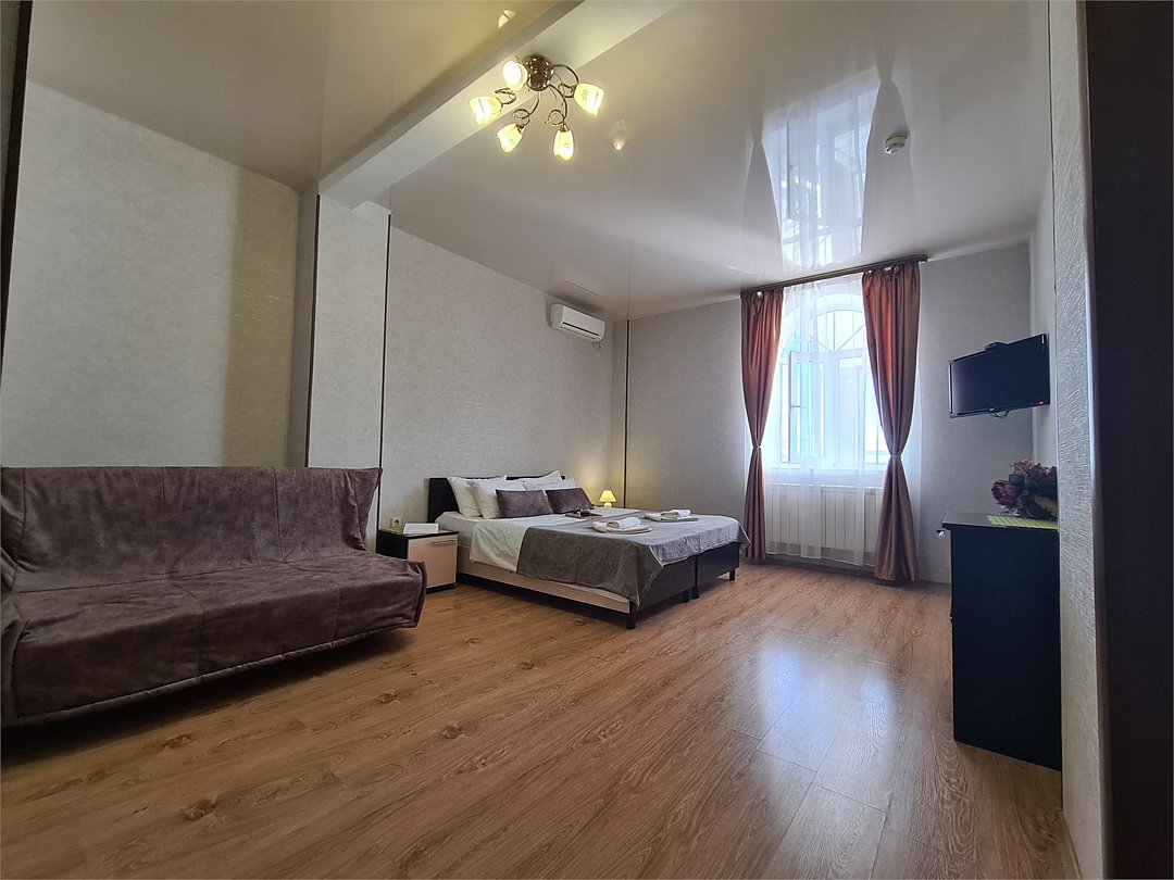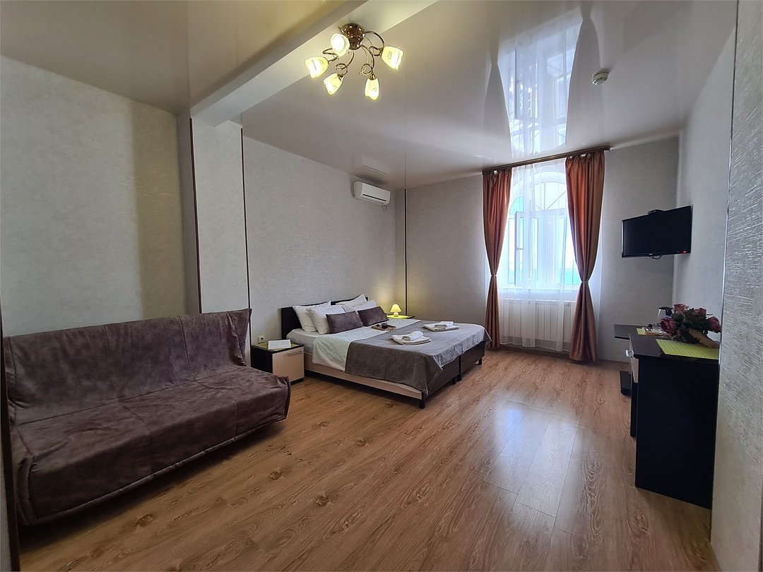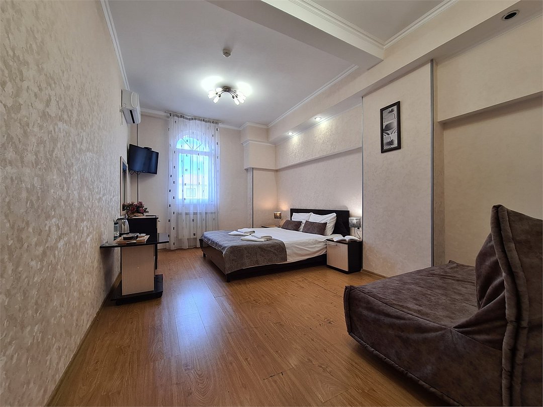 телевизор, Wi-Fi, кондиционер, ванная комната, санузел, две односпальные или большая двуспальная кровать, шкаф для одежды, зеркало, чайник, раковина, душ, вид на город, диван-кровать, мини-холодильникВ гостиничном номере