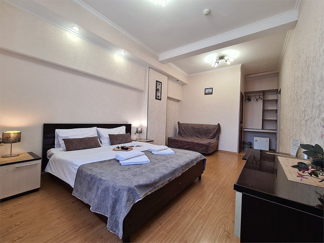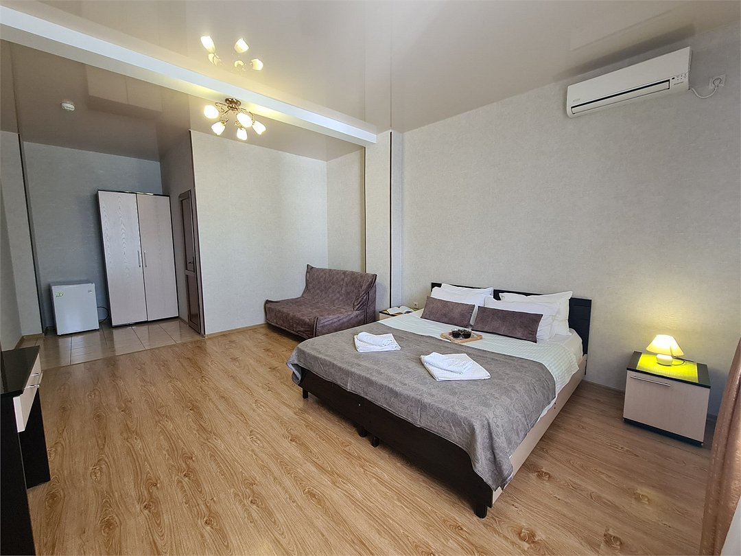 Wi-Fi, холодильник, кондиционер, светильник, фен, ванная комната, ванна, тапочки, двуспальная кровать, шкаф для одежды, журнальный столик, зеркало, пуфики, отопление, душ, вид на море, ламинат, туалетный столик, туалетные средства, туалет, диван-кровать, телевизор с плоским экраном, мини-холодильникВ гостиничном номере