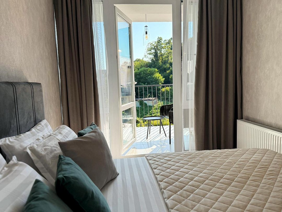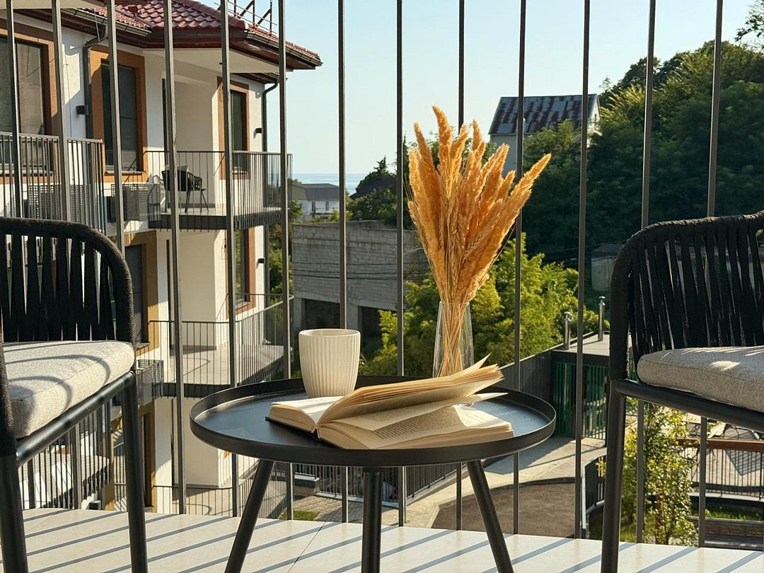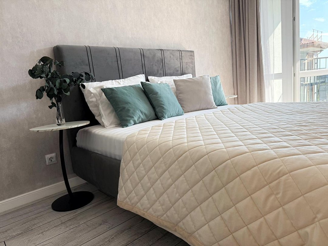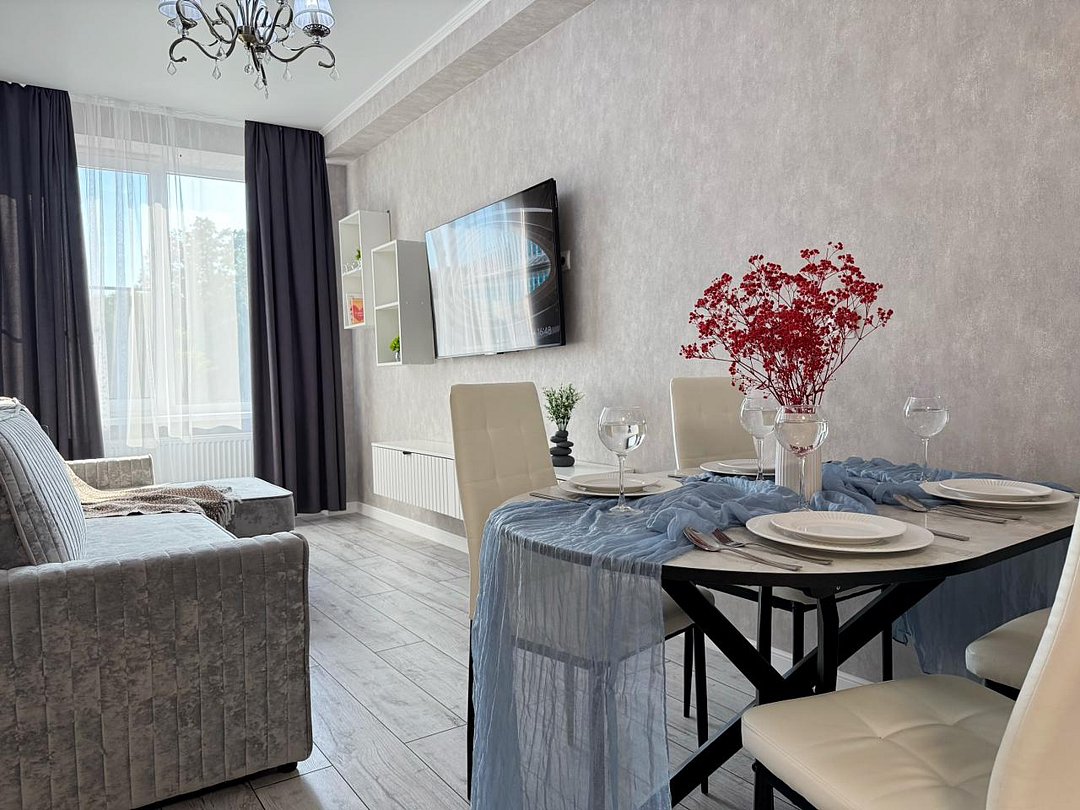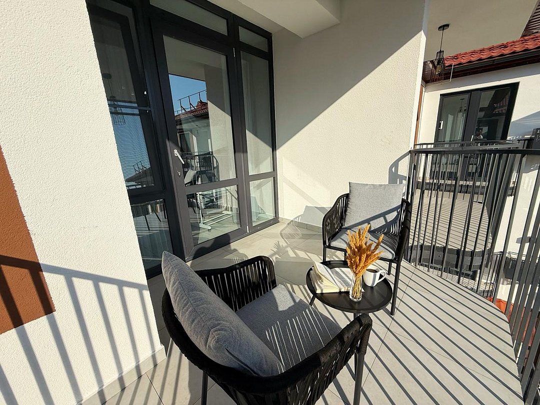 Апартаменты с современным дизайном полностью укомплектованы для комфортного проживания и включают удобные спальные места и свежее постельное белье, кухню, оснащенную бытовой техникой и набором посуды, кондиционер, телевизор и Wi-Fi, большой балкон с зоной отдыха, современный санузел с душем и гигиеническими принадлежностями.