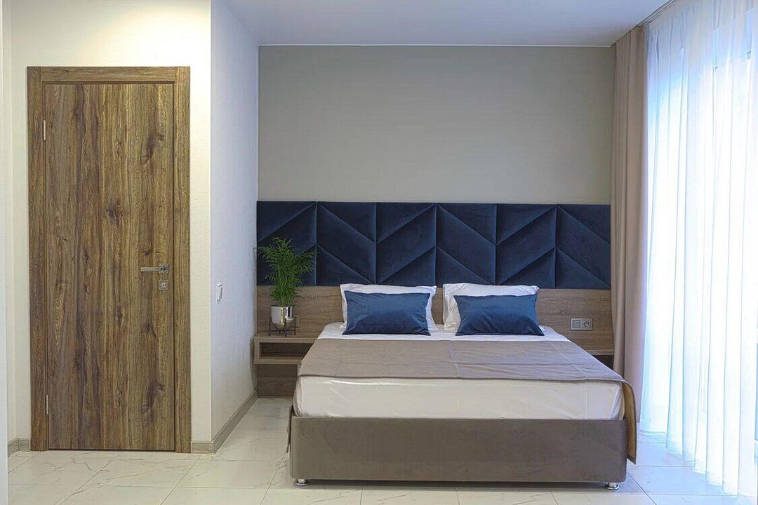 Wi-Fi, фен, электронные замки, душевая кабина, тапочки, две односпальные или большая двуспальная кровать, диван, зеркало, пуфики, чайник, унитаз, туалетные средства, сплит-система, телевизор с плоским экраном, мини-холодильник, шкаф-купе, балкон с боковым видом на мореВ номере