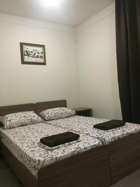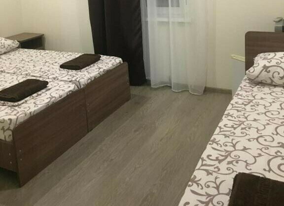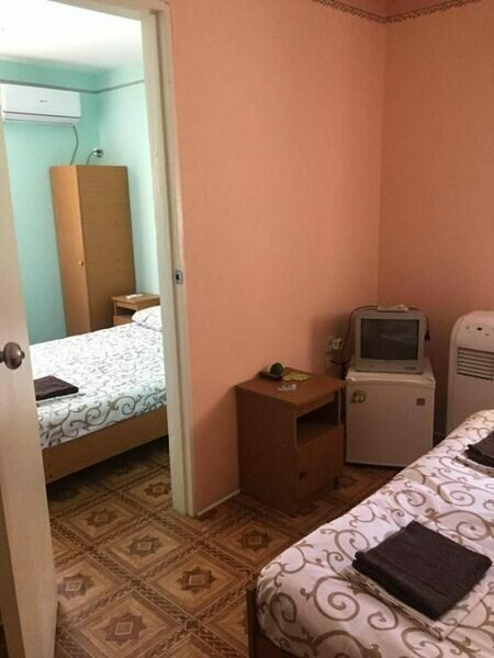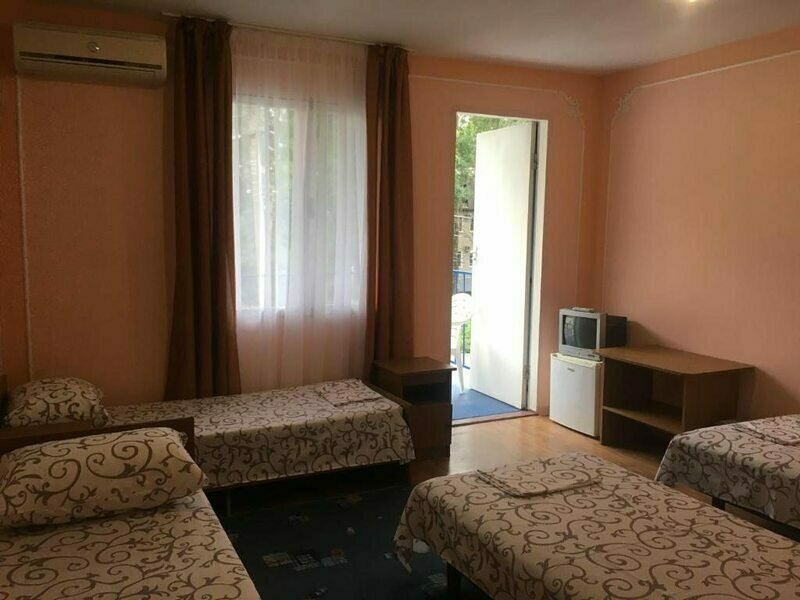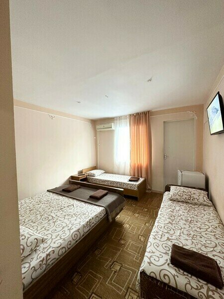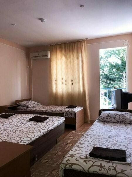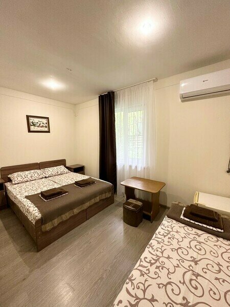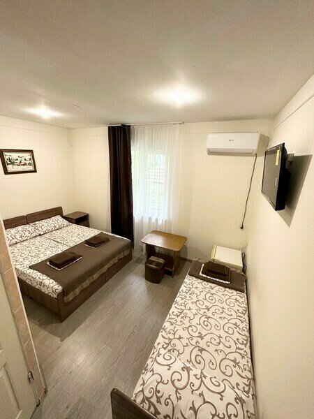 В номере: 2 односпальные кровати и 1 двуспальная кровать. Имеется телевизор, кондиционер, вешалка, шкаф. Индивидуальная ванная комната. В стоимость входит: Постельное бельё, полотенца, туалетные принадлежности, WI-Fi бесплатно на всей территории. Парковка за территорией.