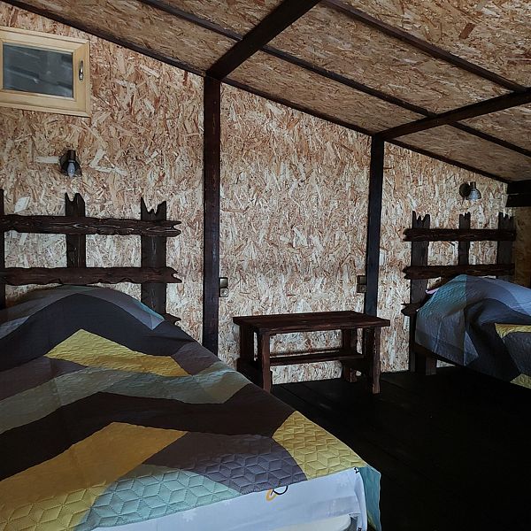 В каждой половине имеется: двухместная кровать, мебель, постельное белье.