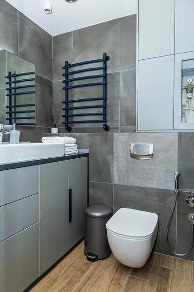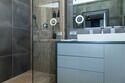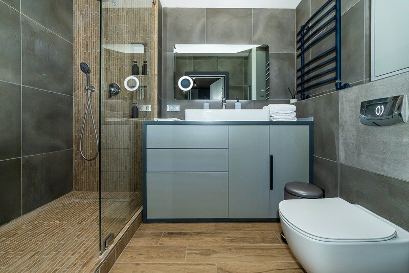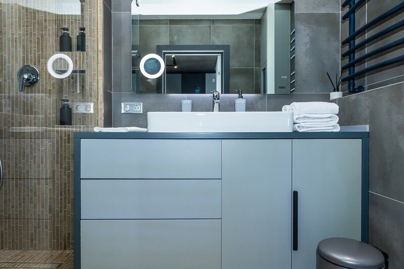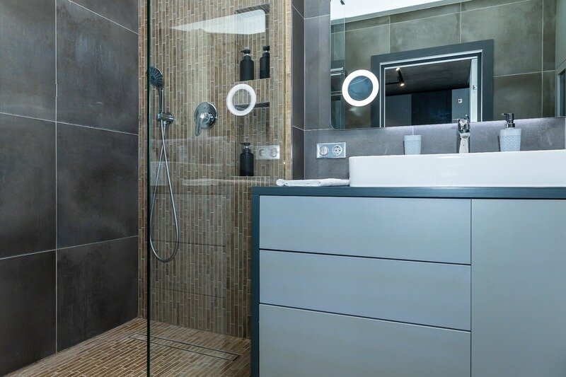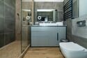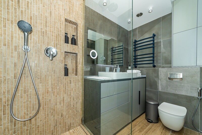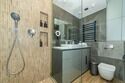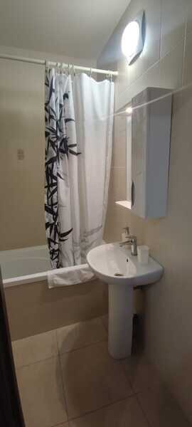 Ванная комната с душевой кабиной, со всеми принадлежностями, а также стиральной машиной.