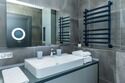 Ванная комната с большой ванной, со всеми принадлежностями, а также стиральной машиной.