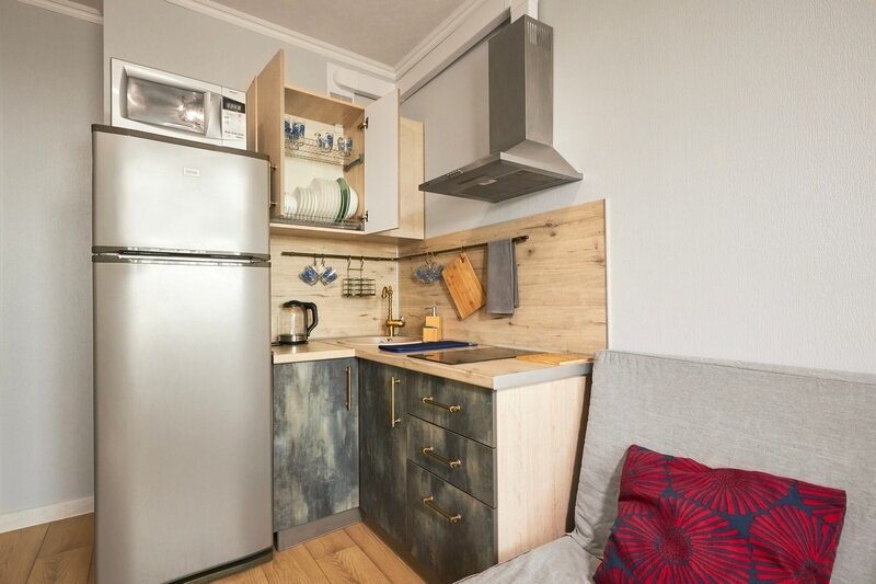 Оборудованная абсолютно всем необходимым кухня — Вам нужны только продукты, которые Вы можете купить на первом этаже дома.