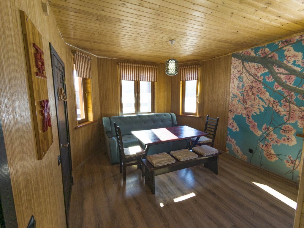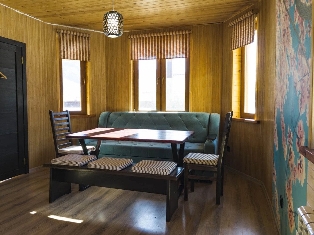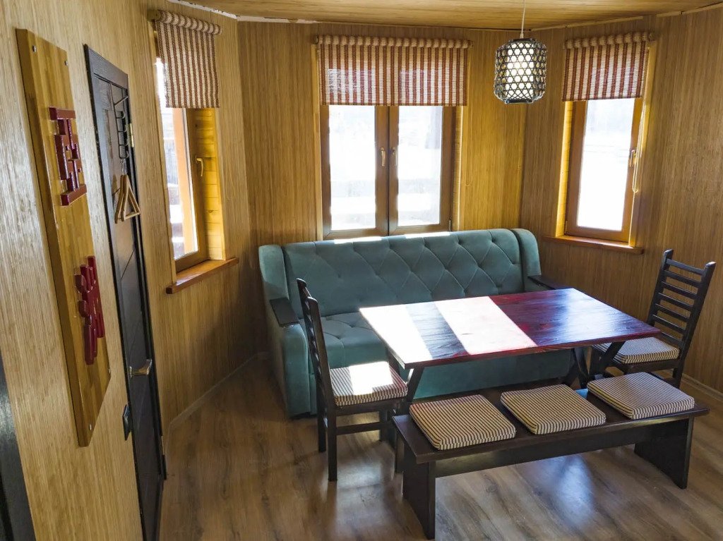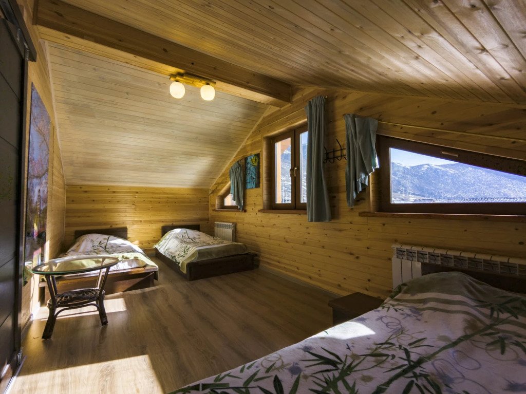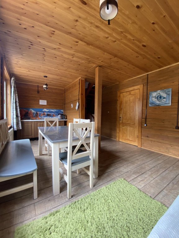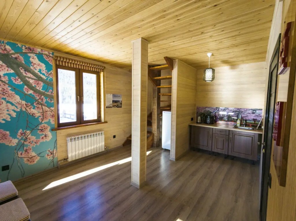 Гостям комплекса предлагается горячая сухая баня, а для ещё большего комфорта есть холодильник, электрический чайник, терраса и обеденный стол. Из окон гости могут любоваться видом на горы.