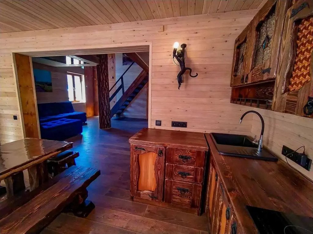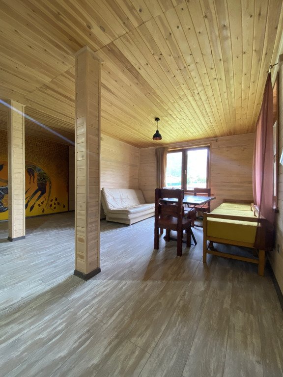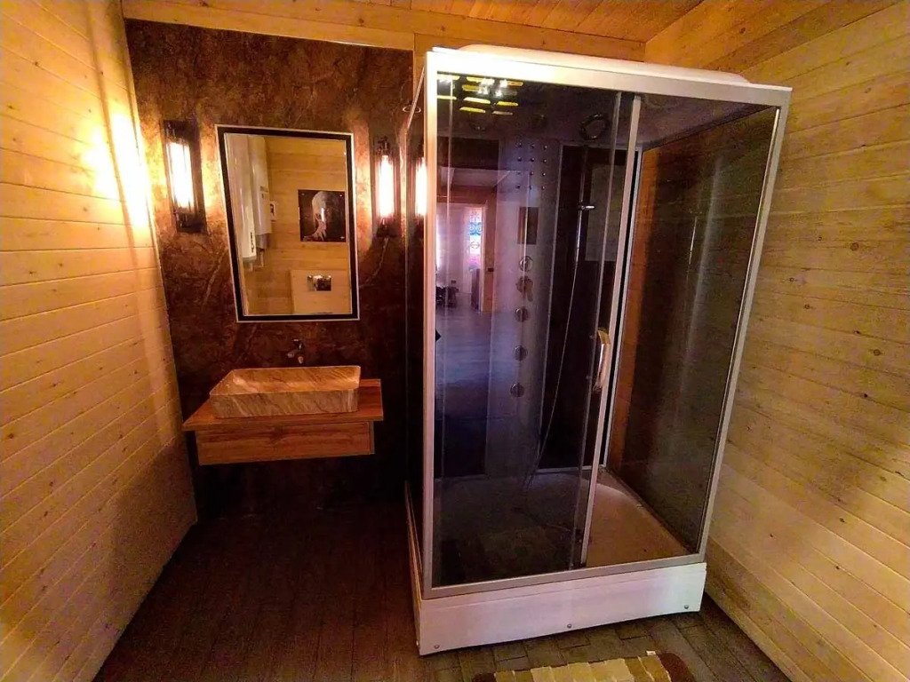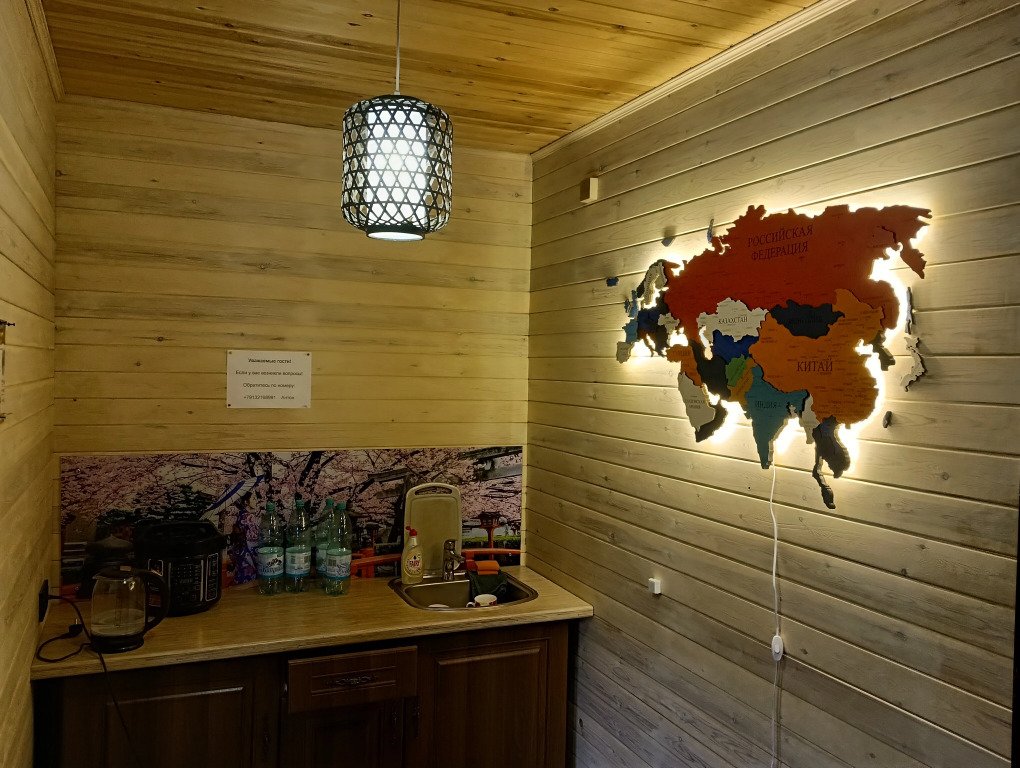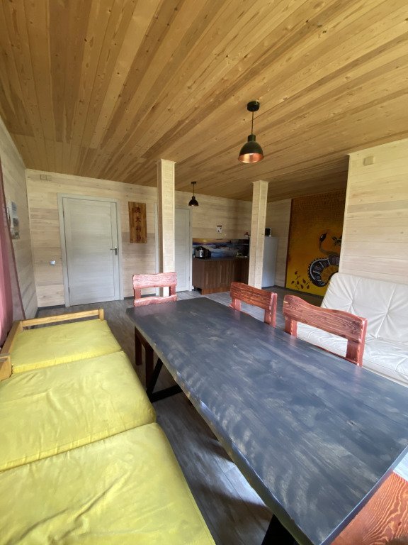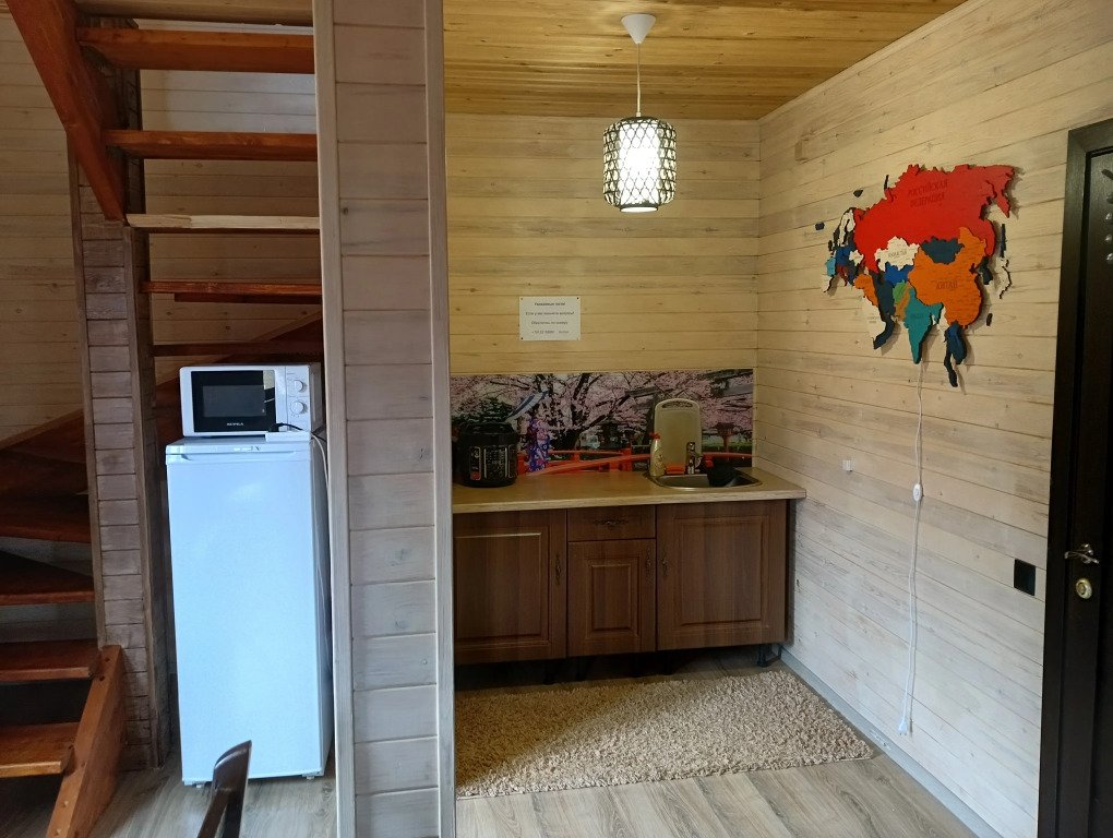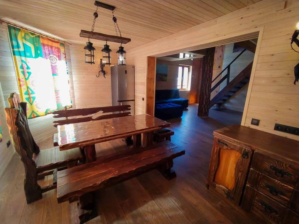 Гостям комплекса предлагается горячая сухая баня, а для ещё большего комфорта есть холодильник, электрический чайник, терраса и обеденный стол. Из окон гости могут любоваться видом на горы.
