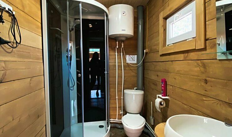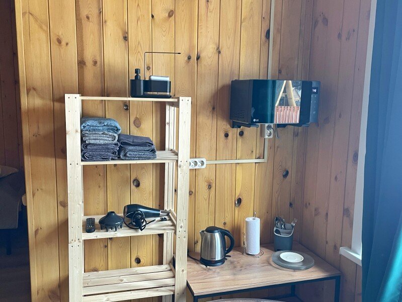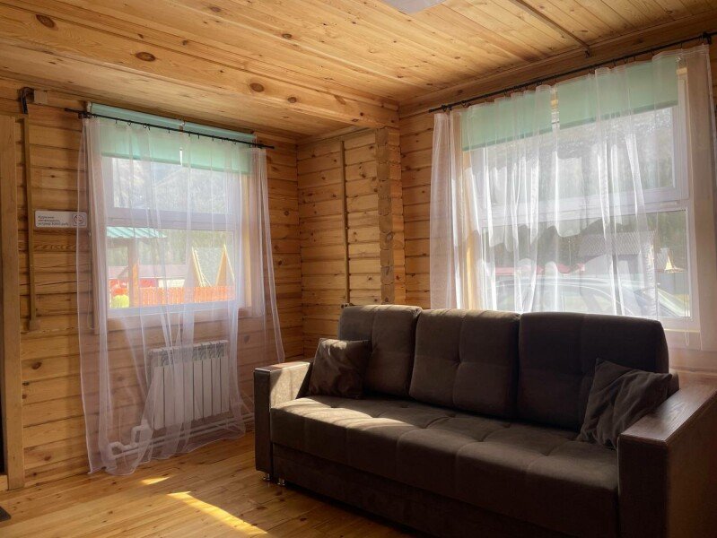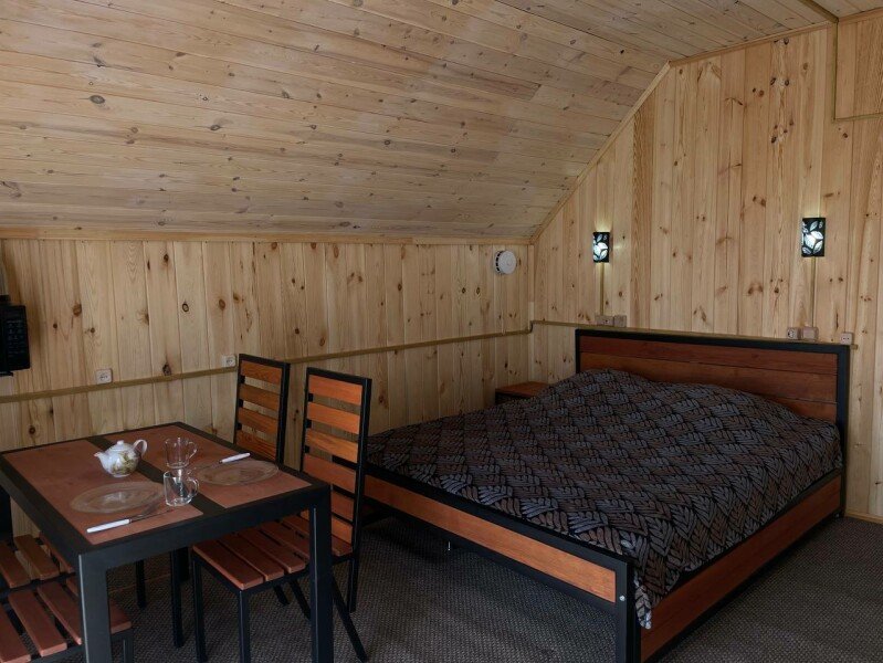 Отдельный дом с теплым полом, душевой кабиной, верандой, кухонной зоной и красивым видом из панорамного окна. ТВ, микроволновая печь, холодильник. Мангал и баня на территории мини-отеля