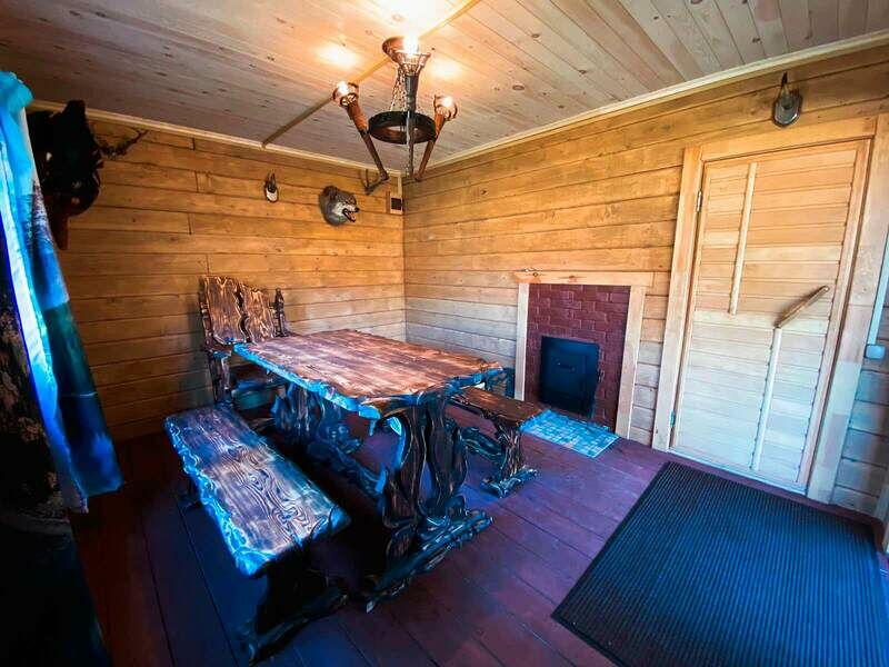 На территории работает баня: парилка и атмосферная комната отдыха, оформленная в старинном стиле, с красивой мебелью из дерева.