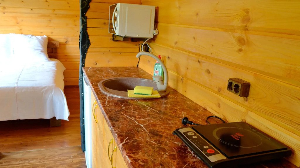 В номере тепло: работает электрокотёл. Приготовление еды возможно на общей кухне и в мангальной зоне.