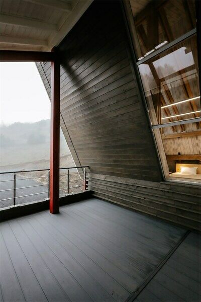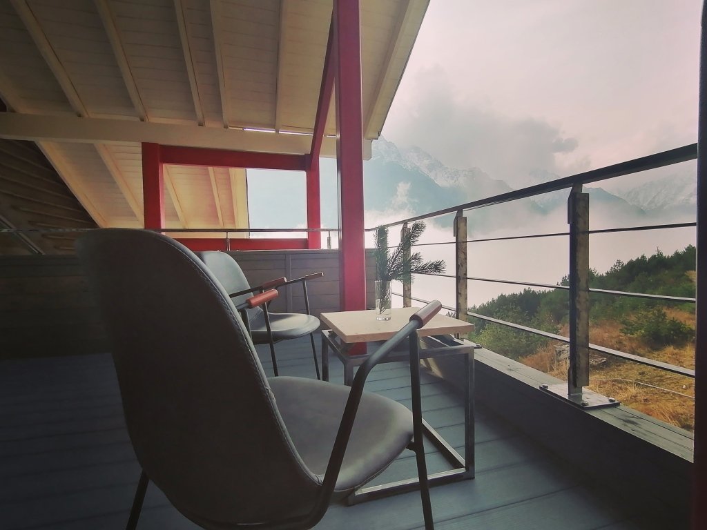 Есть открытая веранда, где можно поесть, любуясь видами. Также, на веранде есть пару шезлонгов и подвесное кресло, можно поваляться на свежем воздухе.