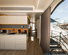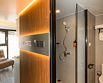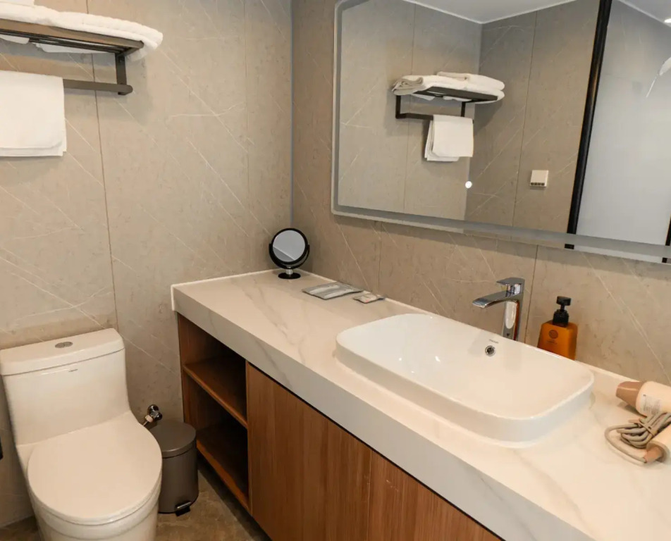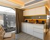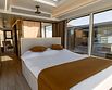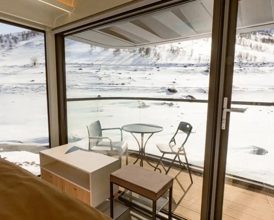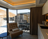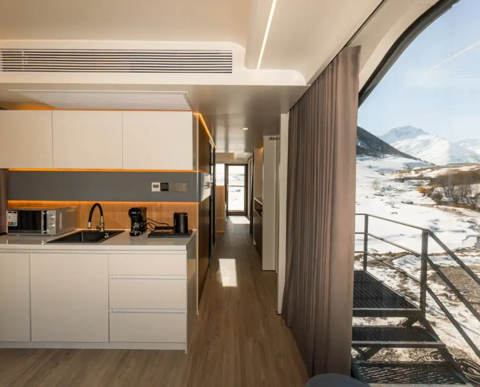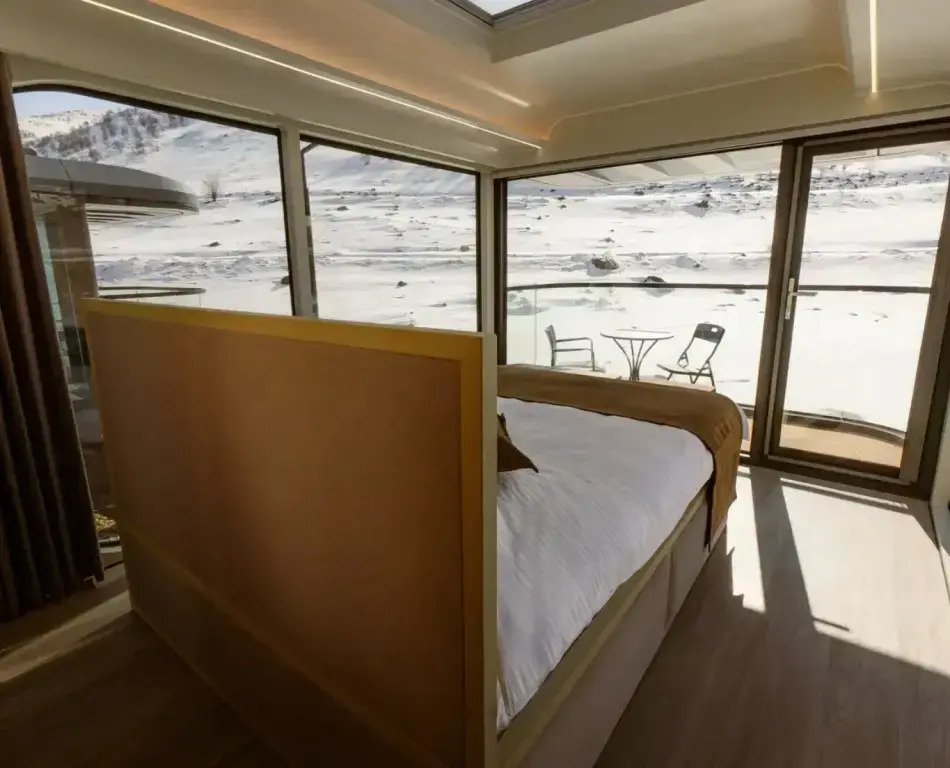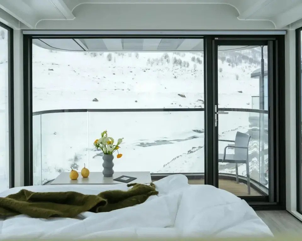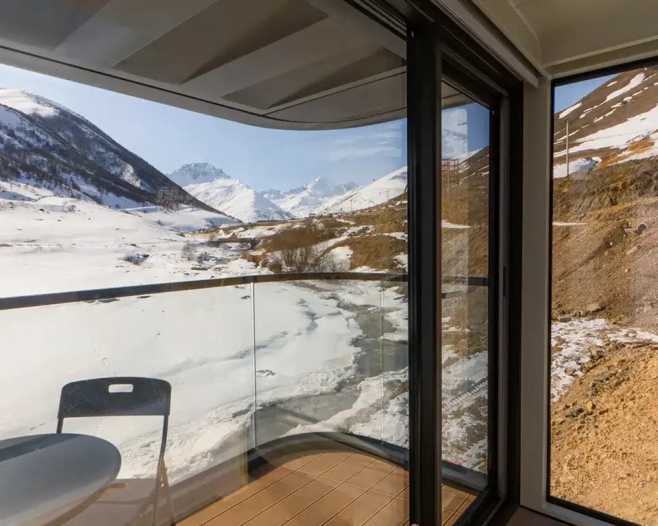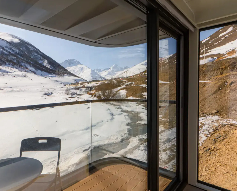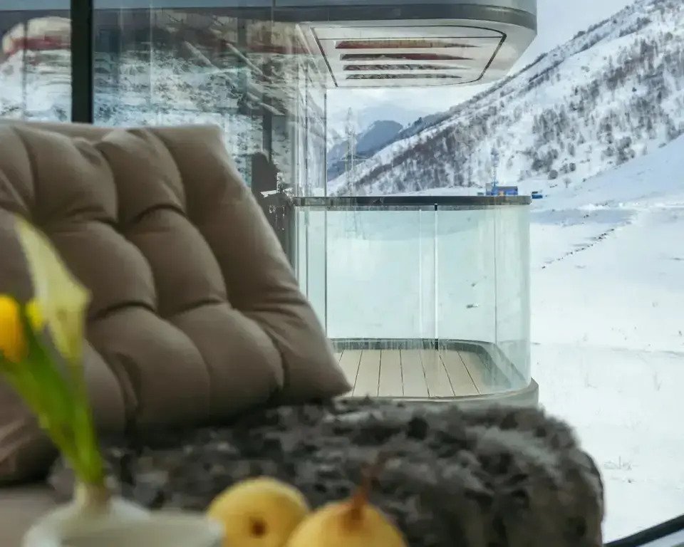 Панорамные окна открывают вид на горы. В номерах установлены проекторы и системы умного дома, которые позволяют управлять оборудованием с одного устройства.