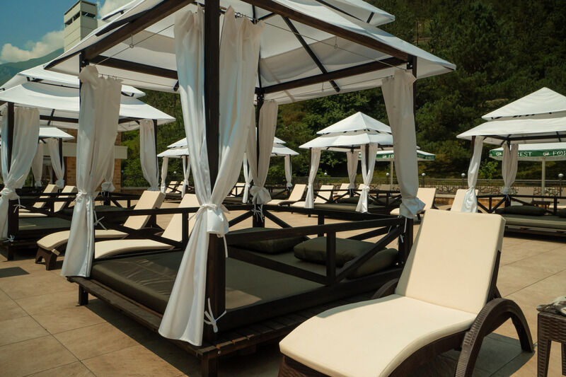 На летней террасе бассейна вы можете отдохнуть в атмосфере уединения в комфортных бунгало. От солнца вас оберегут зонты и шторки-паруса, а мягкие матрасы и подушки помогут насладиться сиестой в горах Осетии.