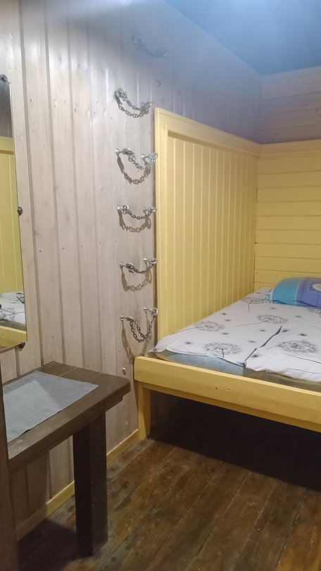 Уютный номер с двухспальной кроватью поможет вам отдохнуть после активного отдыха. Санузел: душ, туалет, умывальник. Есть детская комната, спортзал.