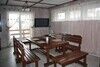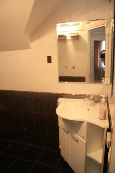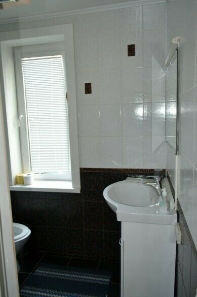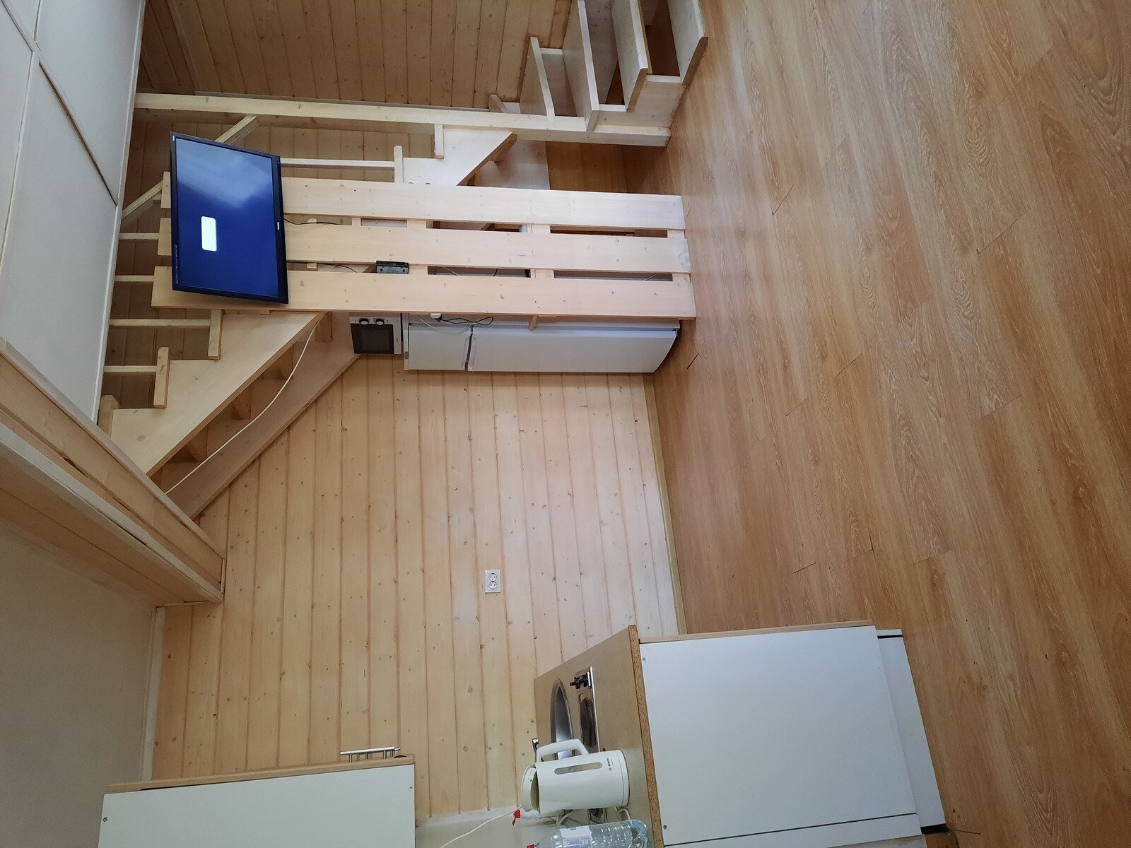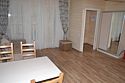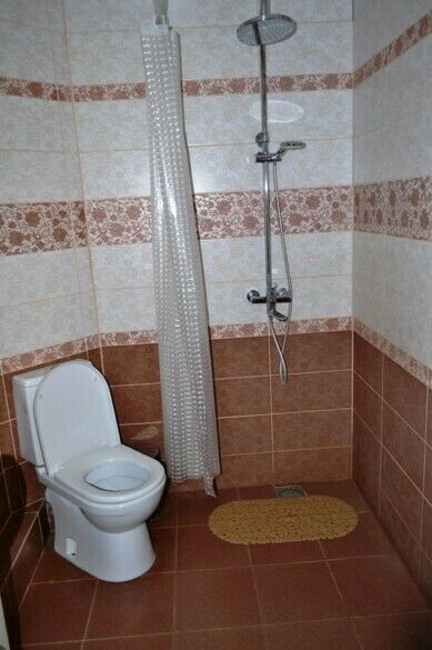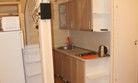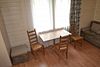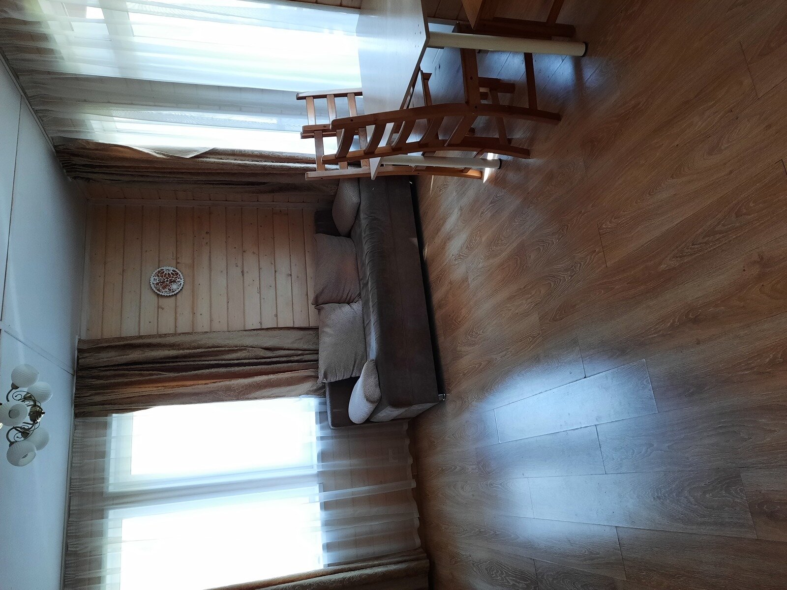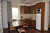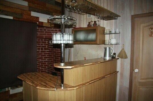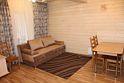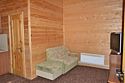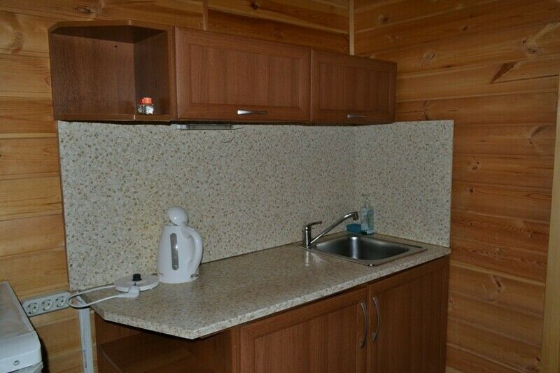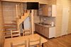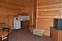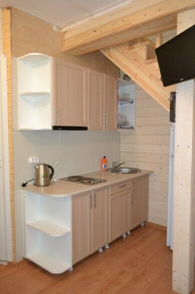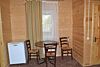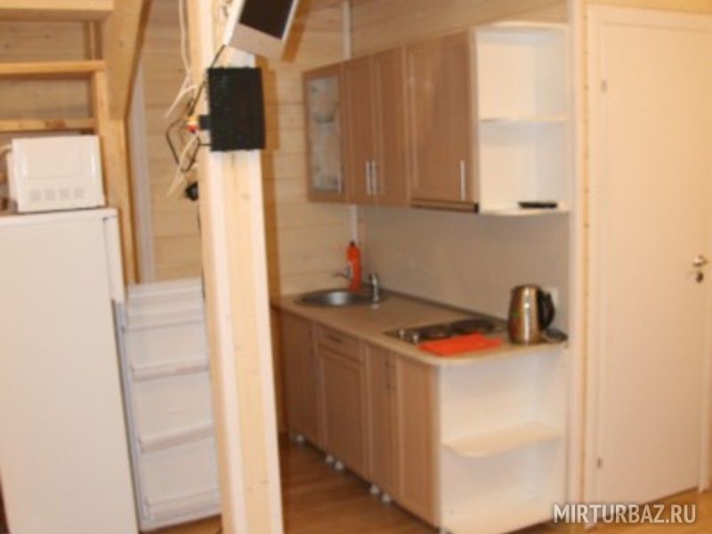 Первый этаж.Гостевая совмещена с кухней. На кухне имеются микроволновка, встроенная плита, электрический чайник и холодильник. В гостевой располагаются диван, стол со стульями, телевизор со спутниковым телевидением. Санузел, душевая кабина, умывальник.