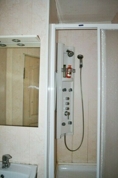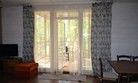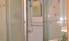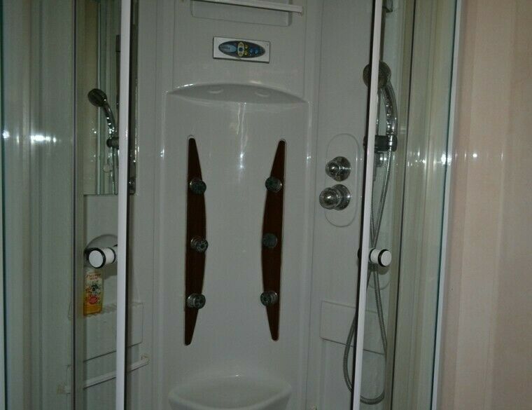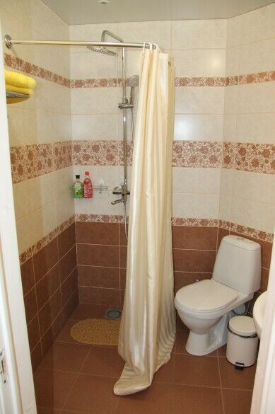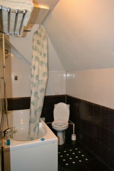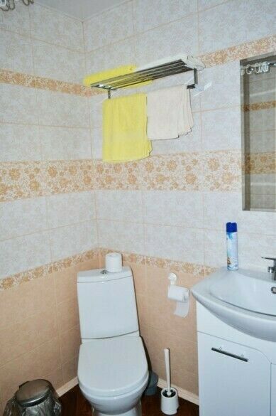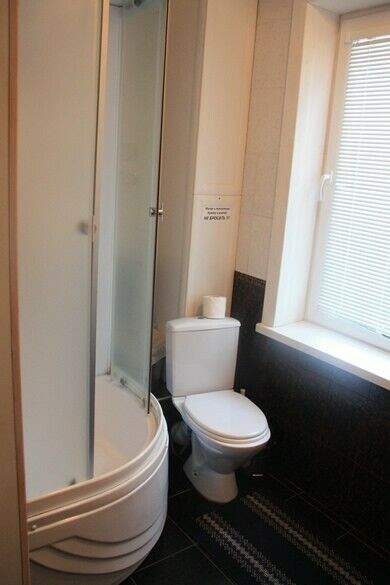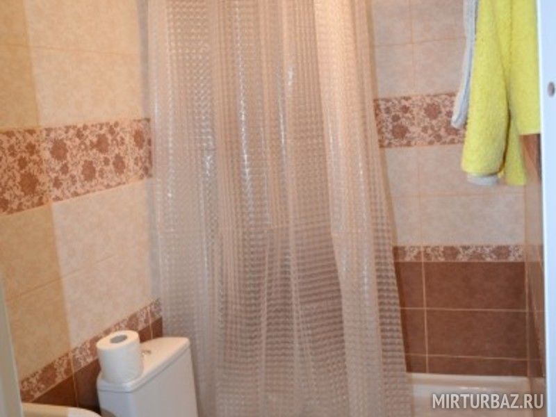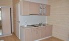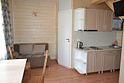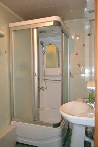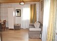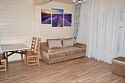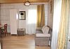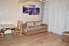 Гостевая совмещена с миникухней. На кухне имеются микроволновка, электрический чайник и холодильник. В гостевой располагаются диван, стол со стульями, телевизор со спутниковым телевидением. Спальня с двухспальной кроватью, гардеробом и трильяж. Санузел, душевая кабина, умывальник.
