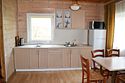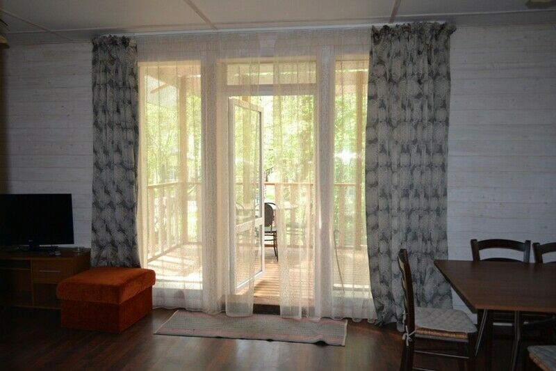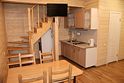 Первый этаж. Гостиная совмещена с полноценной кухней-столовой, с хорошим дневным освещением, с выход на веранду. На кухне имеются микроволновая печь, электрический чайник, холодильник, электрическая плита и полный набор посуды. В гостевой располагаются диван, телевизор со спутниковым телевидением. Спальня, две односпальные кровати,тумбочка прикроватная и гардероб. Санузел, душевая кабина, умывальник.