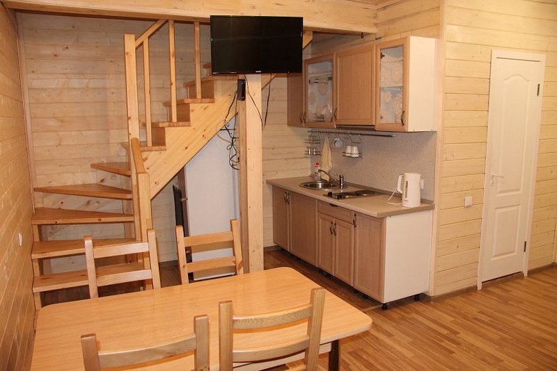 Первый этаж. Гостиная совмещена с полноценной кухней. На кухне имеются микроволновая печь, электрический чайник, холодильник, электрическая плита и полный набор посуды. В гостевой располагаются диван, стол со стульями, телевизор со спутниковым телевидением. Санузел, душевая кабина, умывальник.