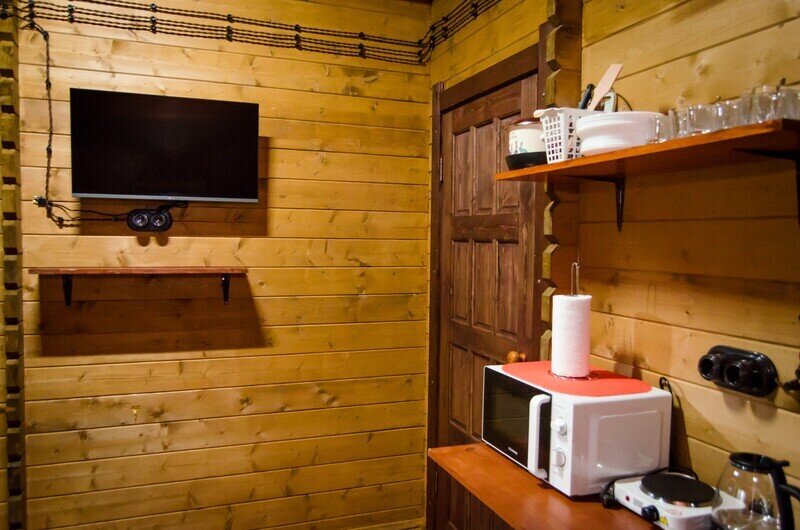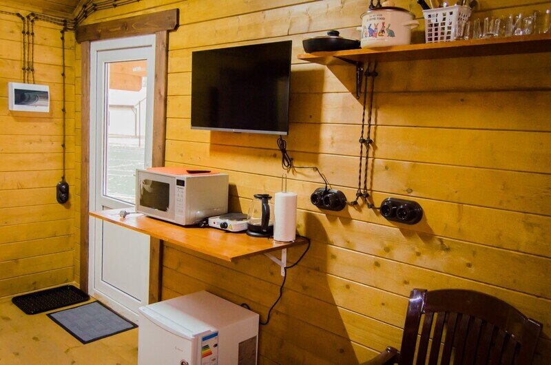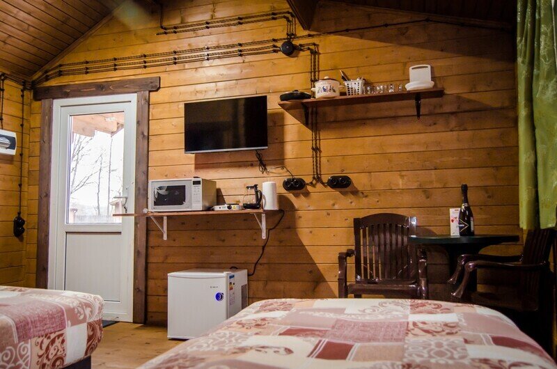 Коттедж Малый на 2 человека»: одноэтажный с отдельным входом и небольшой открытой верандой для отдыха, рассчитан на проживание 2-х человек, две полуторные кровати (можно сдвинуть), прикроватные тумбочки, стол, стулья, большой ТВ, Холодильник, СВЧ, электрический чайник и электроплитка с необходимым набором посуды для самостоятельного приготовления пищи. Санузел с душевой кабиной, водонагреватель. На улице имеется мангал (один на два коттеджа).
