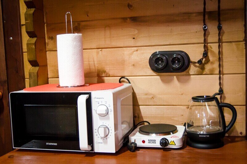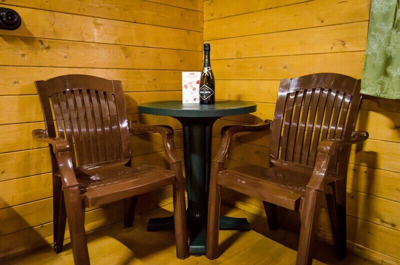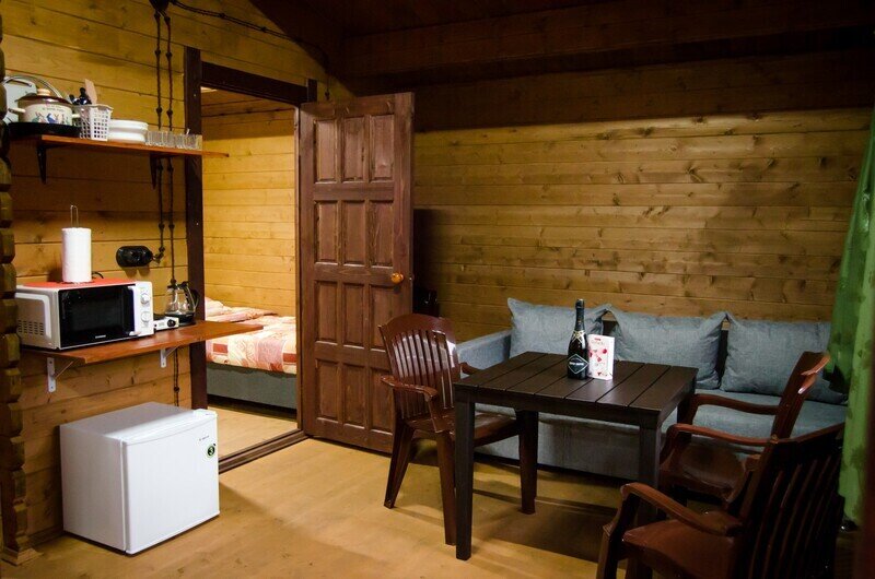 Коттедж Большой на 4-6 человек: одноэтажный с отдельным входом и открытой верандой для отдыха. Гостиная с двуспальным диваном, стол, стулья, большой ТВ, Холодильник, СВЧ, электрический чайник и электроплитка с необходимым набором посуды для самостоятельного приготовления пищи.