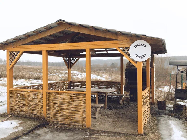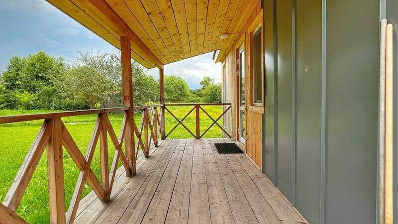 Вторая веранда обращена на просторное поле. На веранде комфортно собраться всей семьей в тёплое время для общих завтраков/обедов/ужинов.