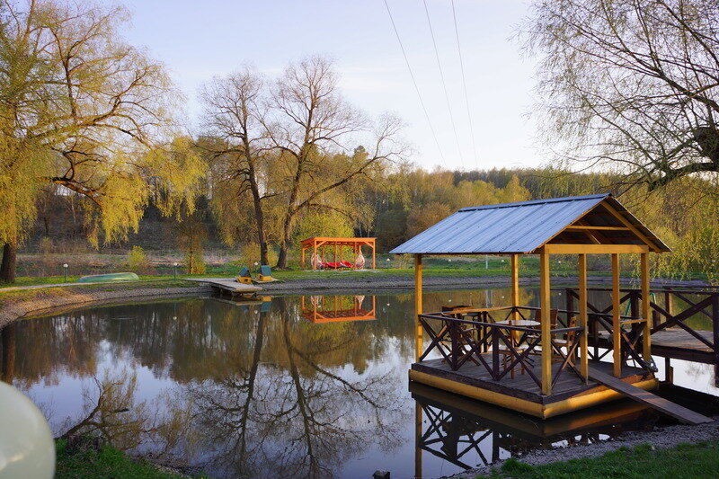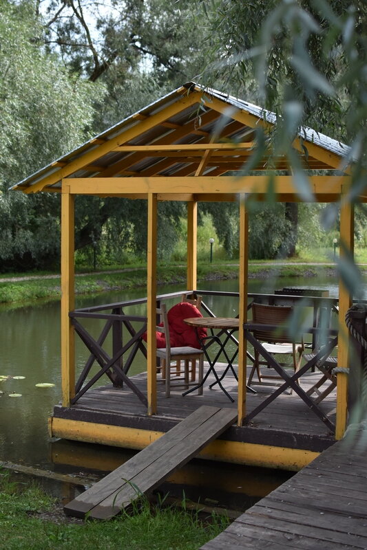 А среди плакучих ив расположился небольшой зарыбленный пруд с большими карпами, сомиками и амуром.