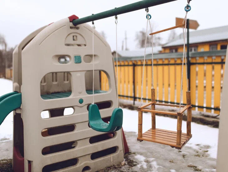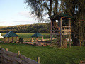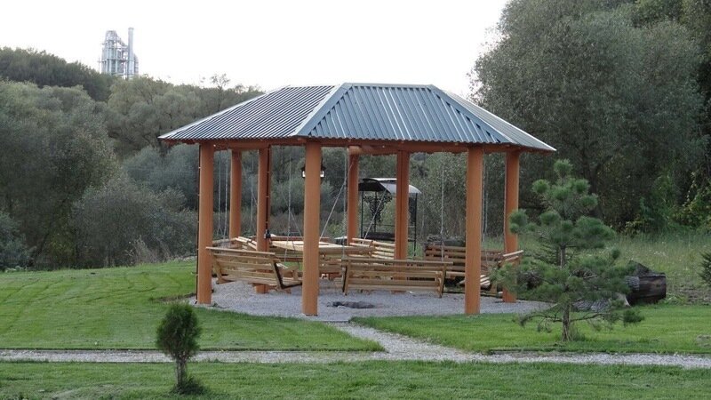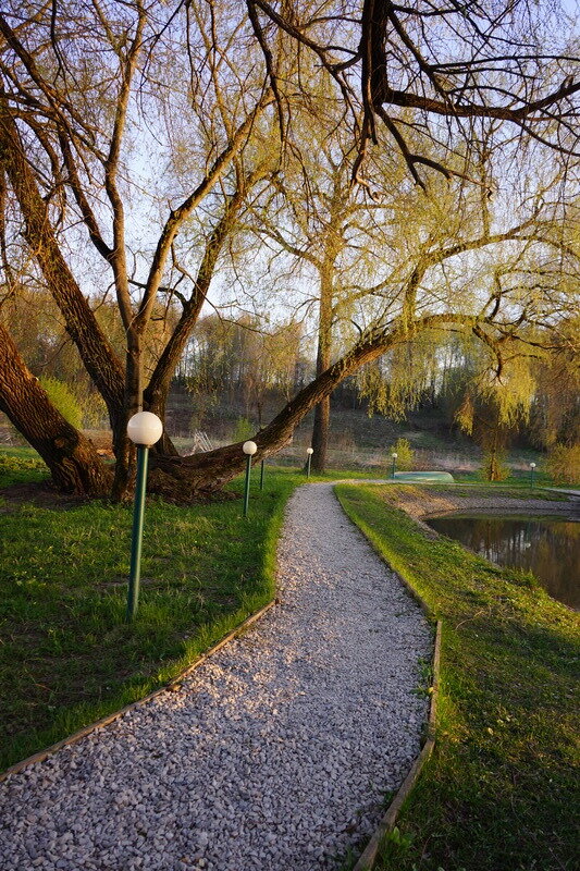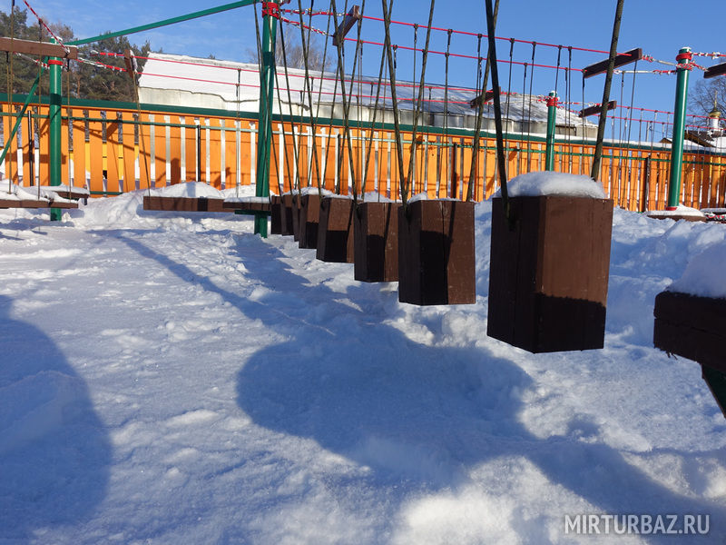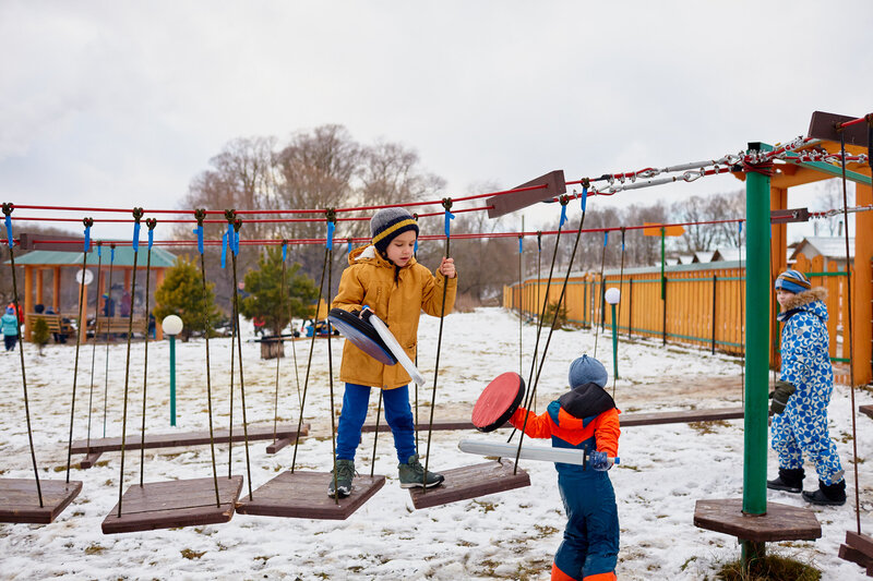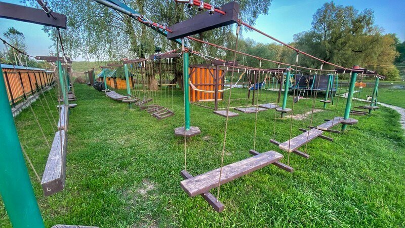 Очень понравилась зона отдыха, прудик, беседки, детская площадка с веревочным парком, домиком на дереве, качелями. -