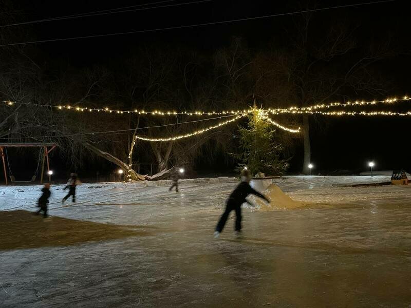 Каток площадью более 200 кв.м. с ночным освещением, гирляндами и уличной музыкой.