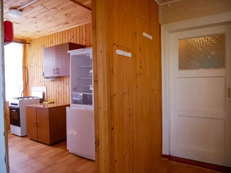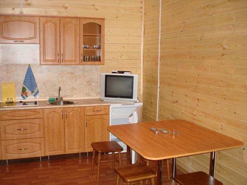Внутри: 2 спальные комнаты, в которых по 2 односпальные кровати, прикроватные тумбы, двустворчатый шкаф, 4 комплекта постельного белья; кухня, в которой располагаются кухонный стол со стульями, холодильник, газовая плита, раковина, кухонный гарнитур с необходимым набором посуды, рассчитанным на 4 персоны (столовые приборы, глубокие и мелкие тарелки, стаканы, бокалы), набором посуды для приготовления пищи (набор кастрюль, сковорода, чайник, кухонный нож, разделочная доска) и другой кухонной утварью. Санузел оборудован душем (холодная и горячая вода), унитазом, а так же аксессуарами для ванной комнаты, полотенцами и необходимыми предметами для уборки помещения.