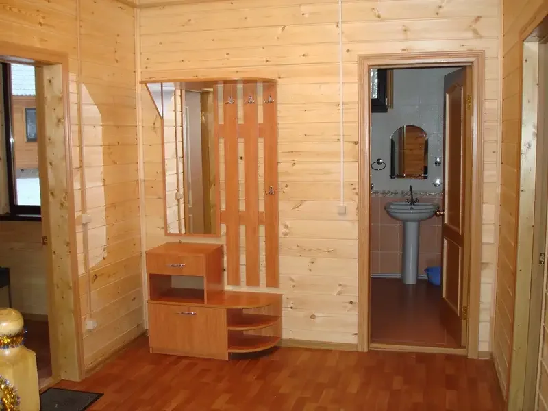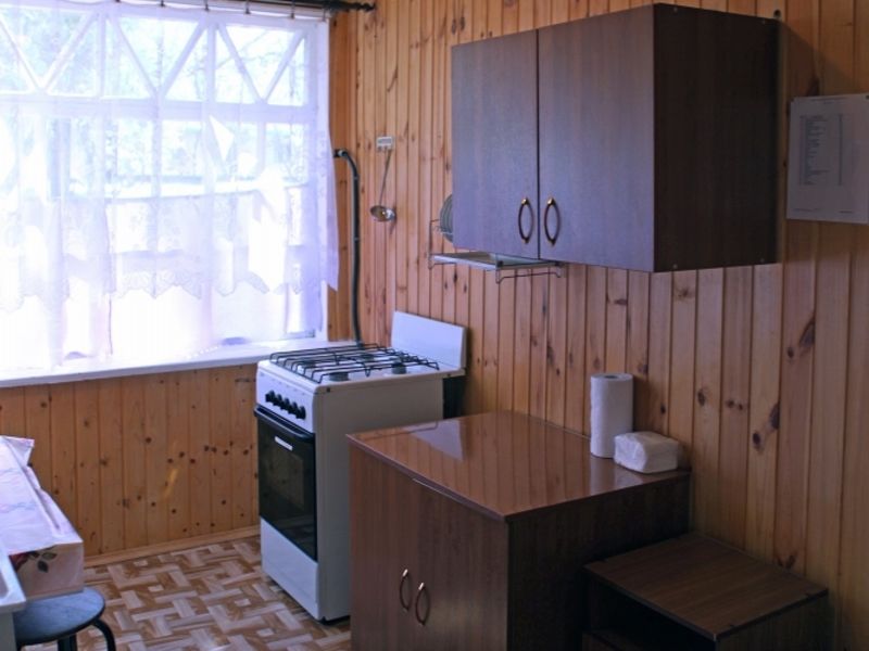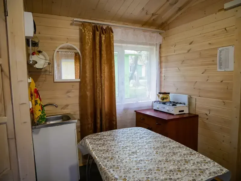 Внутри: веранда, 2 спальные комнаты, в которых по 2 односпальные кровати, прикроватные тумбы, двустворчатый шкаф, 4 комплекта постельного белья; кухня, в которой располагаются кухонный стол со стульями, холодильник, газовая плита, раковина, кухонный гарнитур с необходимым набором посуды, рассчитанным на 4 персоны (столовые приборы, глубокие и мелкие тарелки, стаканы, чайный сервиз), набором посуды для приготовления пищи (набор кастрюль, сковорода, чайник, кухонный нож, разделочная доска) и другой кухонной утварью. Санузел оборудован душем (холодная и горячая вода), унитазом, а так же аксессуарами для ванной комнаты, полотенцами и необходимыми предметами для уборки помещения.