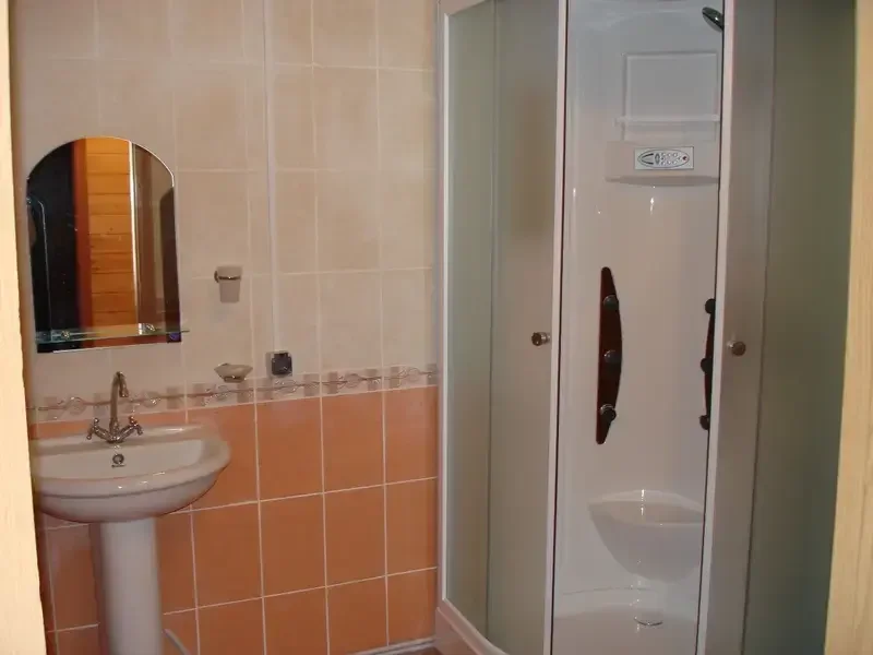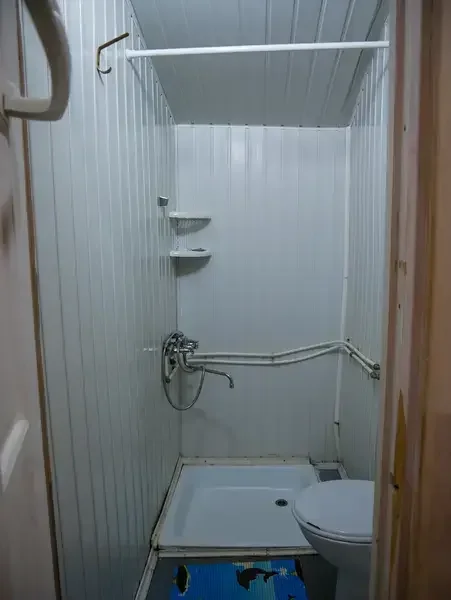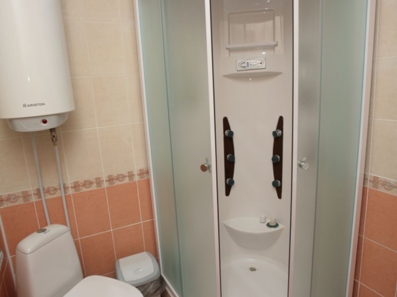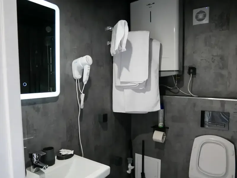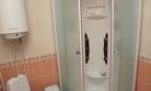 Санузел оборудован душевой кабиной, унитазом, раковиной и полотенцесушителем, а также аксессуарами для ванной комнаты, полотенцами и необходимыми предметами для уборки.