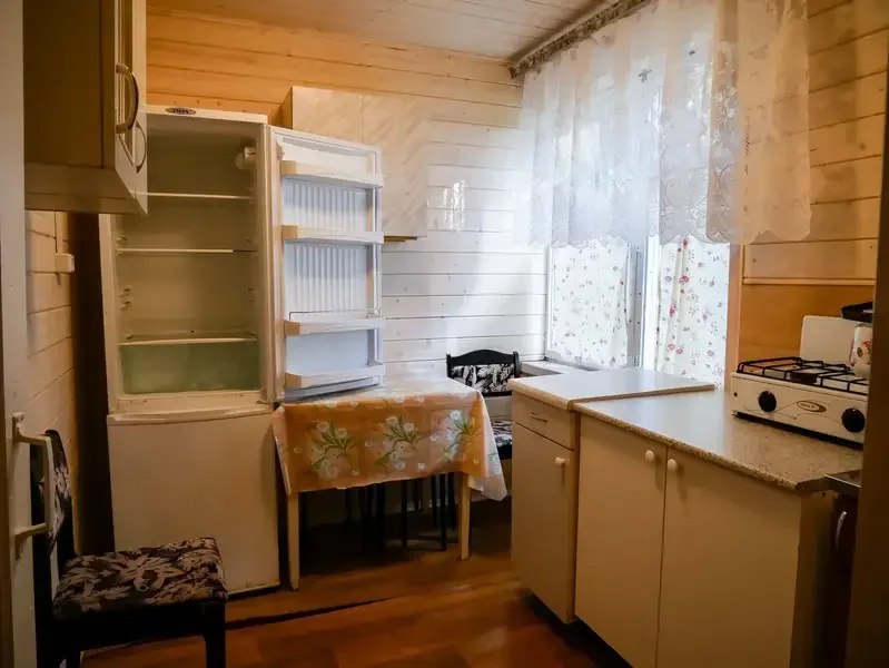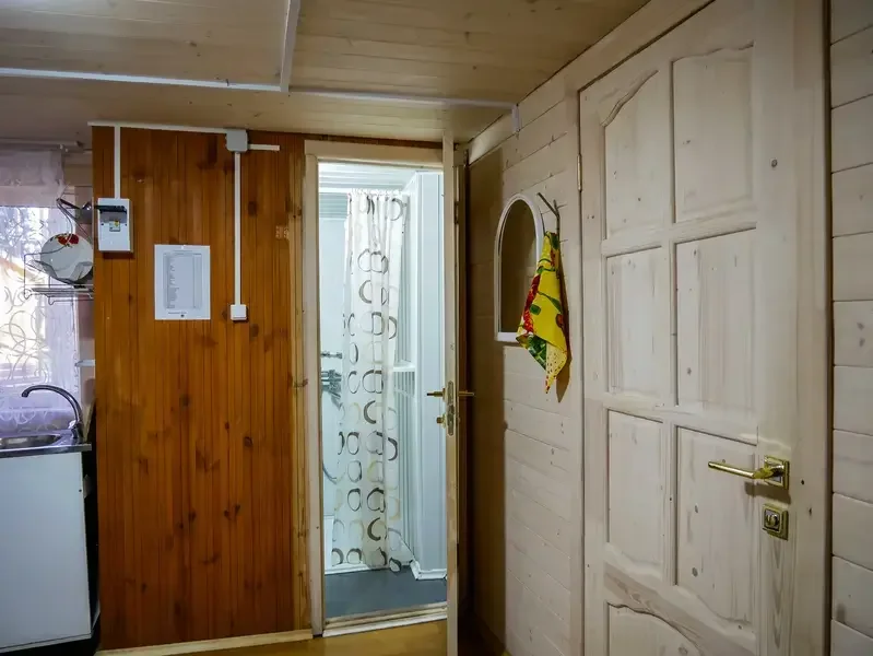 Внутри: веранда, 2 спальные комнаты, в которых по 2 односпальные кровати, прикроватные тумбы, двустворчатый шкаф, 4 комплекта постельного белья; кухня, в которой располагаются кухонный стол со стульями, холодильник, газовая плита, раковина, кухонный гарнитур с необходимым набором посуды, рассчитанным на 4 персоны (столовые приборы, глубокие и мелкие тарелки, стаканы, бокалы), набором посуды для приготовления пищи (набор кастрюль, сковорода, чайник, кухонный нож, разделочная доска) и другой кухонной утварью. Санузел оборудован душем (холодная и горячая вода), унитазом, а так же аксессуарами для ванной комнаты, полотенцами и необходимыми предметами для уборки помещения.