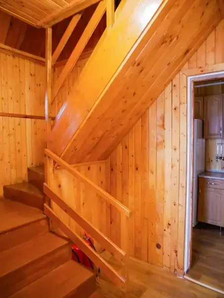 1 этаж: спальная комната, в которой 2 односпальные кровати, прикроватные тумбы, двустворчатый шкаф, 2 комплекта постельного белья; кухня, в которой располагаются кухонный стол со стульями, холодильник, газовая плита, раковина, кухонный гарнитур с необходимым набором посуды, рассчитанным на 4 персон (столовые приборы, глубокие и мелкие тарелки, стаканы, бокалы), набором посуды для приготовления пищи (набор кастрюль, сковорода, чайник, кухонный нож, разделочная доска) и другой кухонной утварью. Санузел оборудован душем (холодная и горячая вода), унитазом, а так же аксессуарами для ванной комнаты, полотенцами и необходимыми предметами для уборки помещения.