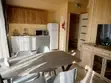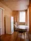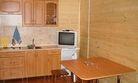 Кухня-гостиная, в которой располагаются кресло-кровать, журнальный столик с телевизором, кухонный стол со стульями, холодильник, электро-варочная поверхность, раковина, кухонный гарнитур с необходимым набором посуды, рассчитанным на 6 персон (столовые приборы, глубокие и мелкие тарелки, стаканы и стопки, чайный сервиз), набором посуды для приготовления пищи (набор кастрюль, сковорода, чайник, кухонный и консервный ножи, разделочная доска) и другой кухонной утварью.