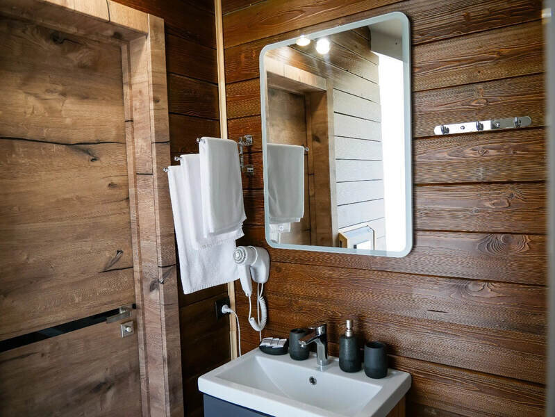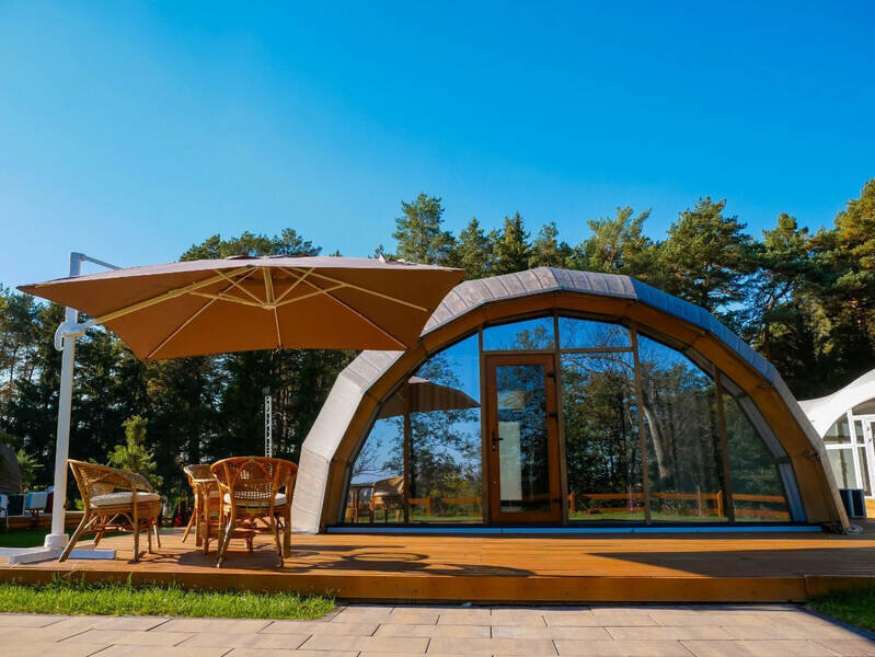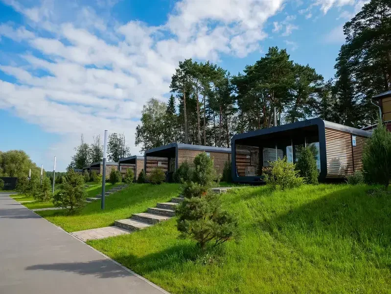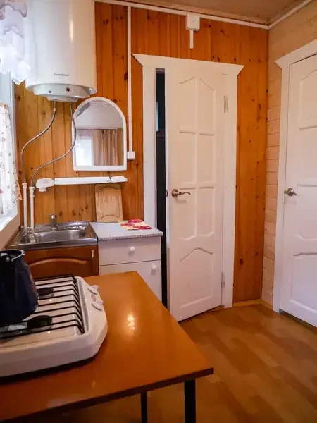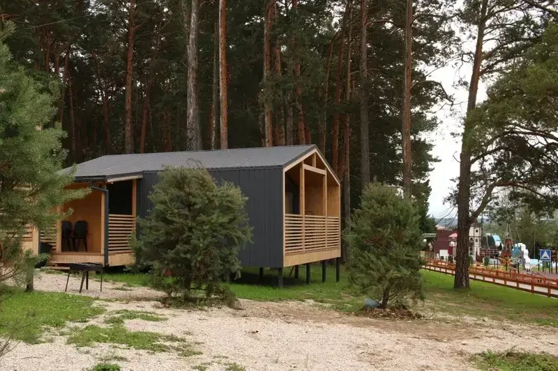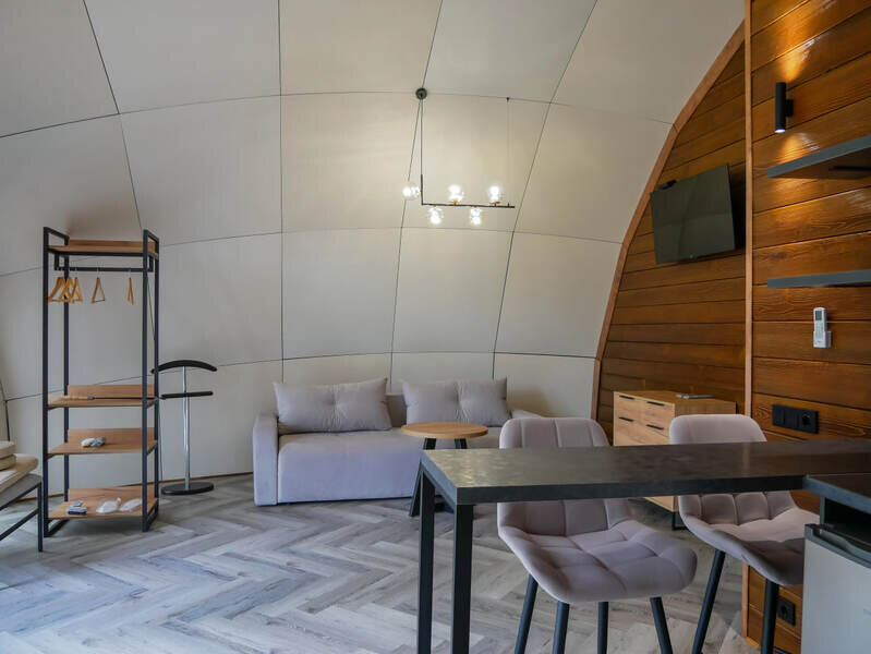 Современный комфортабельный модульный дом-студия с полностью оборудованной кухней, обеденной зоной и панорамными окнами. В доме есть двуспальная кровать и раскладывающийся диван. Санузел с водонагревателем, фен.