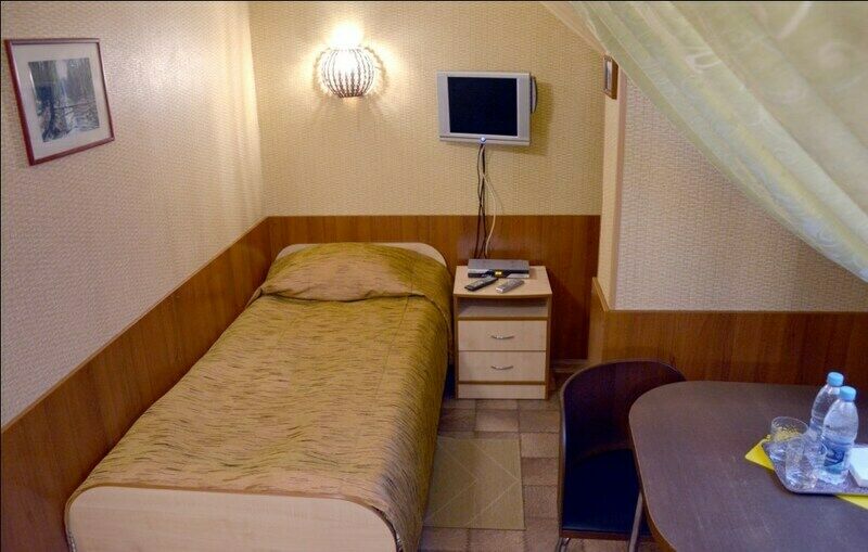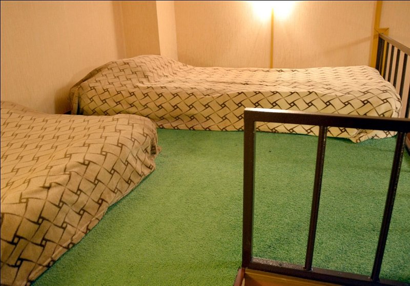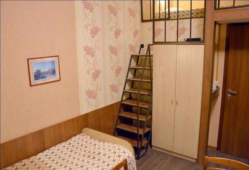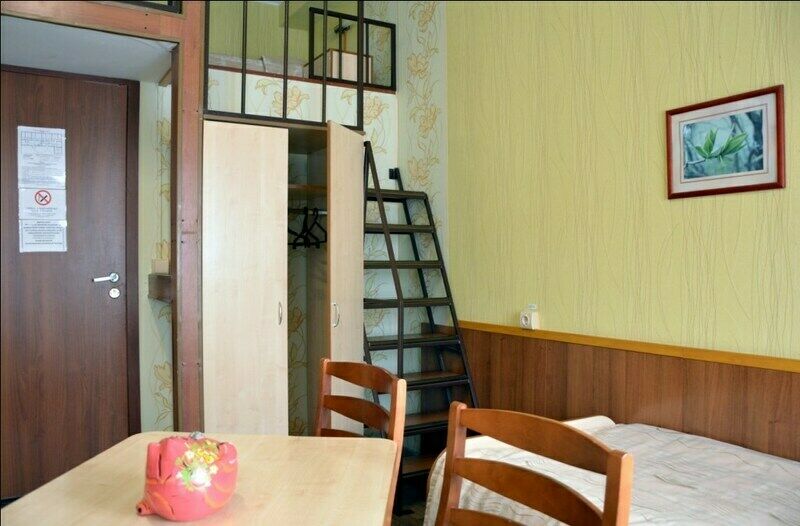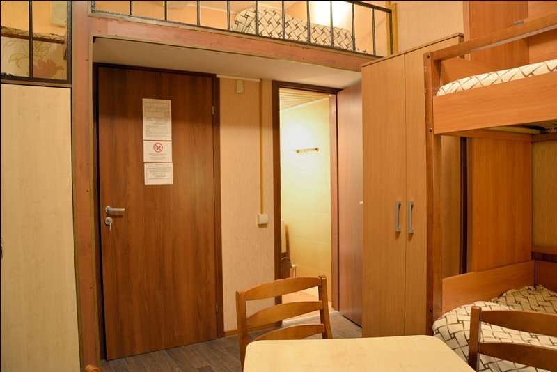 Стандартный четырехместный номер эконом-класса Оригинальная планировка этого номера делает его привлекательным для семейного размещения либо для компании, предпочитающей бюджетный вариант отдыха Пространство номера разделено на 2 зоны – верхнюю и нижнюю. В нижней зоне - 2 односпальных кровати, телевизор, мебель для отдыха и размещения вещей. Наверх ведет удобная металлическая лестница с перилами. Зона отдыха (антресоли/полуэтаж) имеет 2 спальных места на широком ковровом подиуме с отдельными светильниками Санузел в номере является неполным. Бесплатное пользование комфортными душевыми кабинами в шаговой доступности от номера В номере 2 односпальных кровати 2 спальных места в верхней зоне отдыха шкаф и тумбы для одежды стол стулья ТВ wi-fi В ванной комнате неполный санузел раковина унитаз жидкое мыло 4 полотенца стаканы