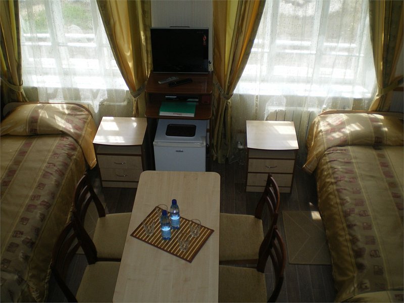 Двухместный номер повышенной комфортности Оригинальное декоративное оформление, комфорт, красивый вид из окна делает этот номер очень привлекательным по соотношению "цена/качество сервиса" В номере 2 односпальные кровати шкаф и тумбы стол и стулья ТВ wi-fi кондиционер тепловентилятор холодильник стаканы дополнительная посуда предоставляется В ванной комнате раковина унитаз душевая кабина 3 вида полотенец жидкое мыло стаканы фен предоставляется