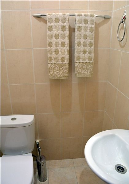 В ванной комнате: неполный санузел, раковина, унитаз, жидкое мыло и 4 полотенца.
