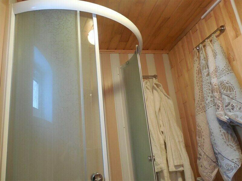 Описание: На усадьбе, веранде и в тамбуре коттеджа: садовая мебель, мангал, кресло-качалка, стол со стульями, гамак, световая гирлянда, откидной столик с пепельницей вешалка для верхней и походной одежды, полка для вещей. На 1 этаже коттеджа - большая гостиная и санузел. На 2 этаже находится спальная зона. В гостиной : красивая мебельная группа - диван двуспальный, кресло-кровать, раздвижной стол и стулья, а также ТВ, холодильник, СВЧ -печь, электрочайник, шкаф для посуды, столовая и чайная посуда, столовые приборы и набор специй ,стаканы , бокалы, рюмки, питьевая вода (0,5 л /чел), пакетированные чай черный и сахар. Спальная зона расположена на мансардном этаже, куда ведет лестница из гостиной.Здесь имеются 2х спальная кровать, прикроватные тумбочки ,мебель для одежды, два раскладывающихся диванчика для отдыха, журнальный столик, пуф-тумба. Санузел: душевая кабина, раковина, унитаз, стационарный фен, 2 халата, 2 больших и 2 средних полотенца, полотенце для ног, жидкое мыло.