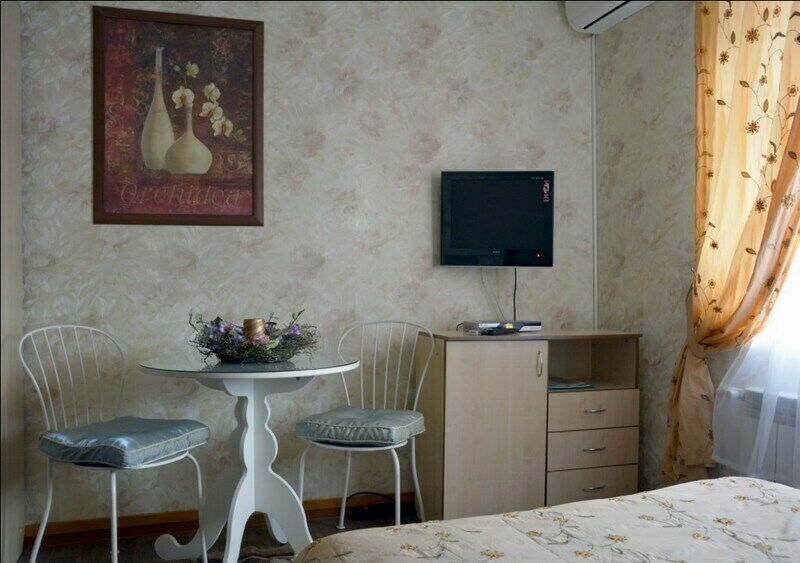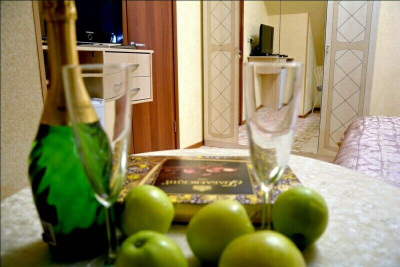 Двухместный номер повышенной комфортности для влюбленных Номер оформлен известным дизайнером Игорем Кретининым в бело-золотой цветовой гамме. Интерьер удачно дополняет настенное шелковое полотно, написанное по мотивам знаменитой картины Климта “Поцелуй". Красивая мебель и продуманный комфорт позволяют в полной мере назвать этот номер райским гнездышком, которое придется по вкусу влюбленным. В номере : большая двуспальная кровать прикроватные тумбы вместительный шкаф стол и стулья ТВ wi-fi кондиционер тепловентилятор холодильник набор посуды. В ванной комнате раковина унитаз биде душевая кабина для двоих халаты 2 больших и 2 средних полотенца, полотенце для ног