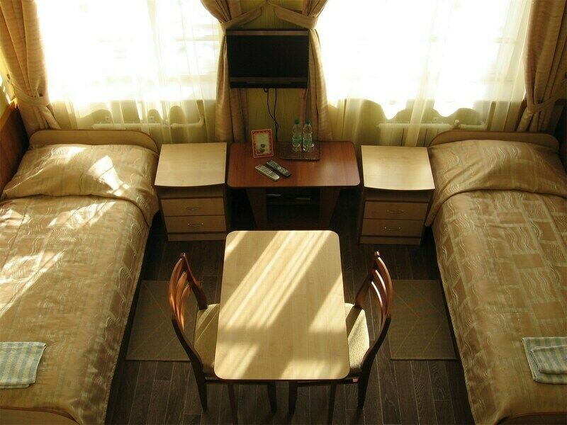 Планировка номера привлекательна для людей, предпочитающих бюджетный вариант отдыха. Бесплатное пользование комфортными душевыми в шаговой доступности В номере две одноместных кровати прикроватные тумбочки шкаф для одежды стол и мягкие табуреты ТВ wf-fi тепловентилятор В ванной комнате неполный санузел раковина унитаз 2 полотенца жидкое мыло стаканы