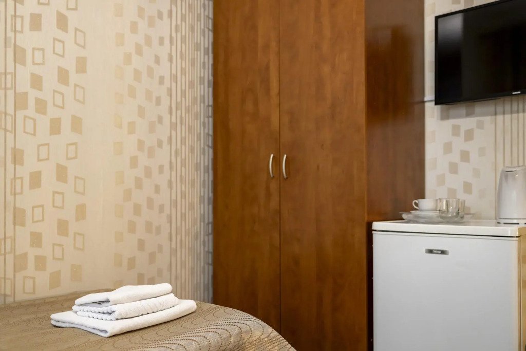 В номере вас будут ждать душ, телевизор и тапочки. Оснащение зависит от выбранной категории номера.