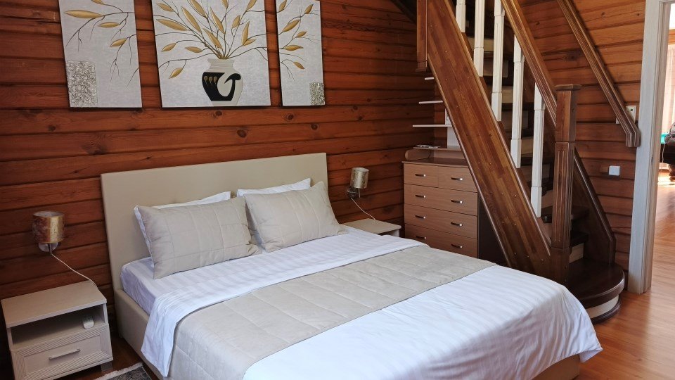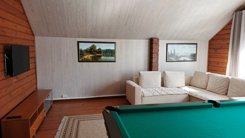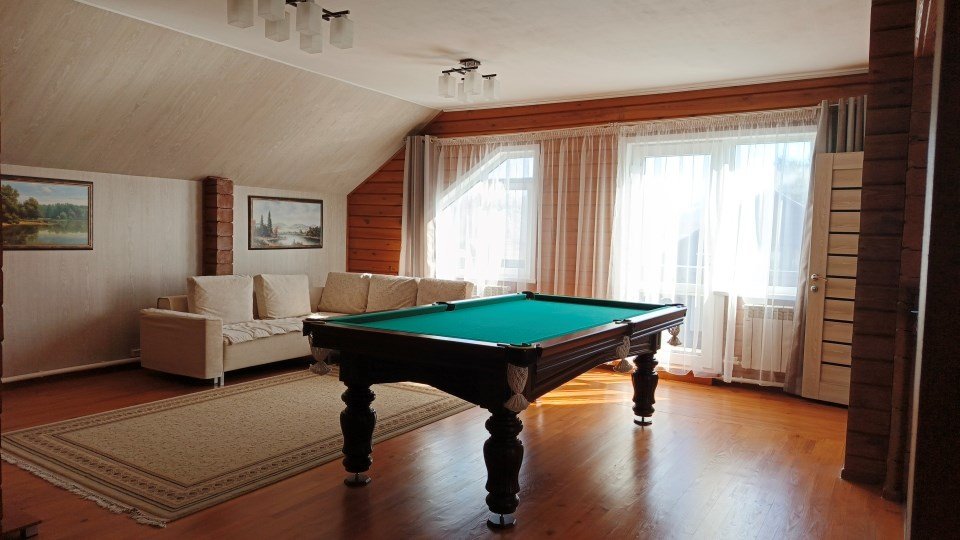 2 этажный коттедж, на 1 этаже кухня, с/у, баня, на 2 этаже три спальни, гостиная с бильярдом.