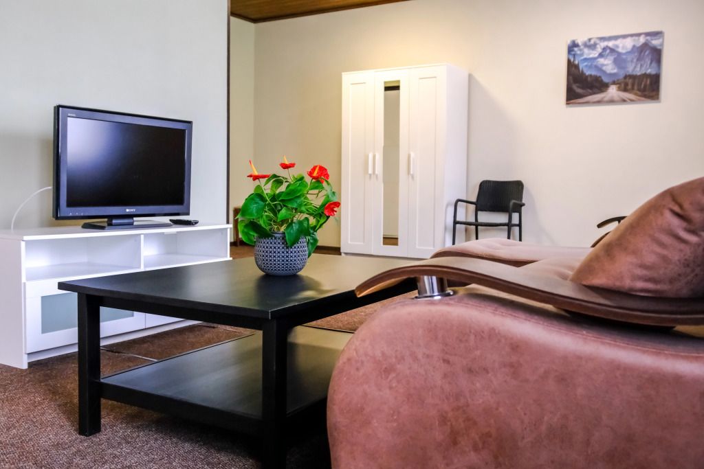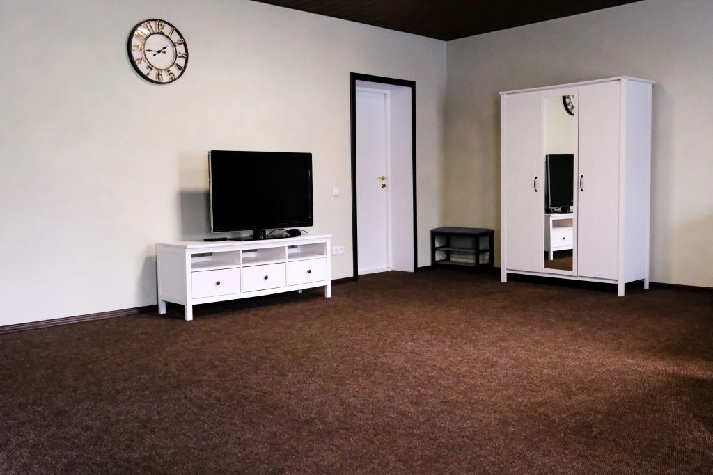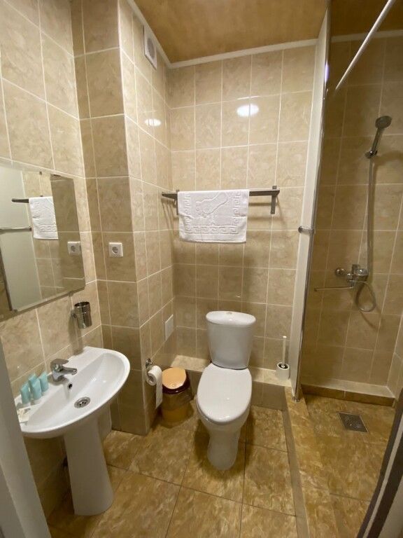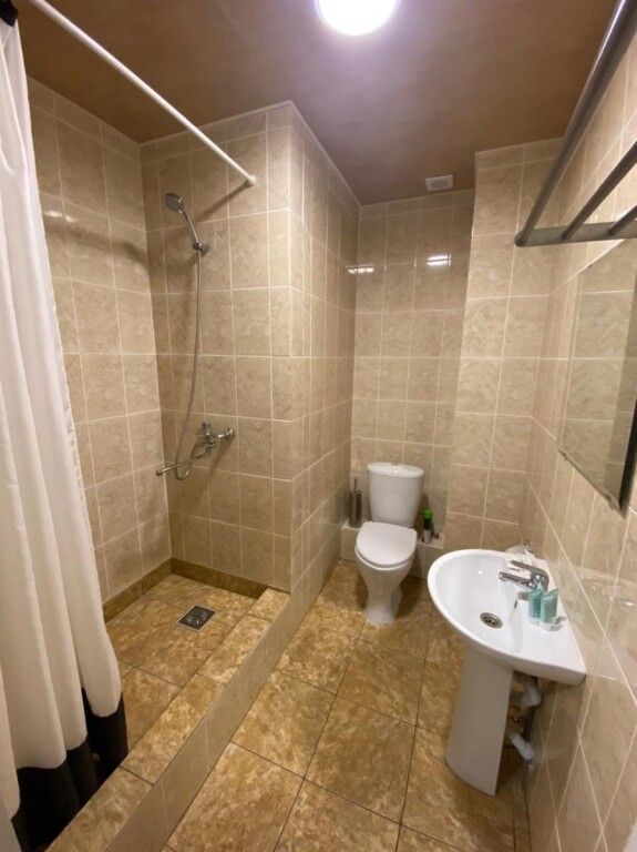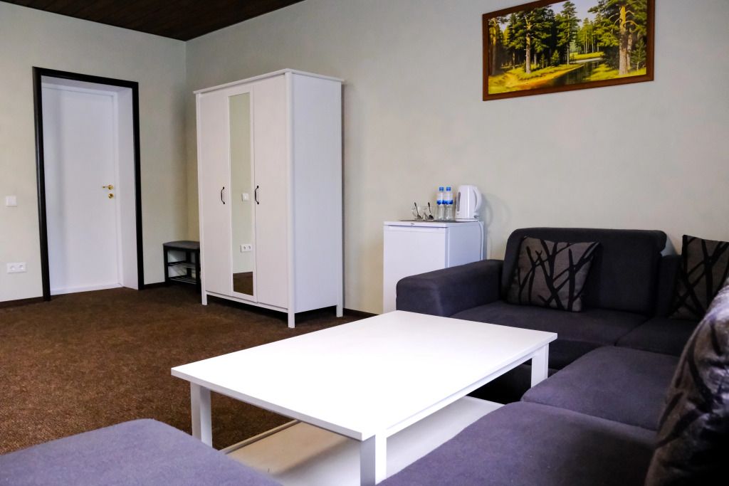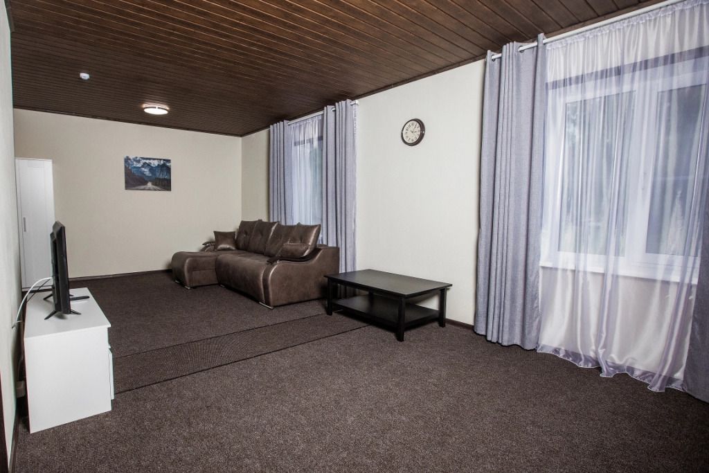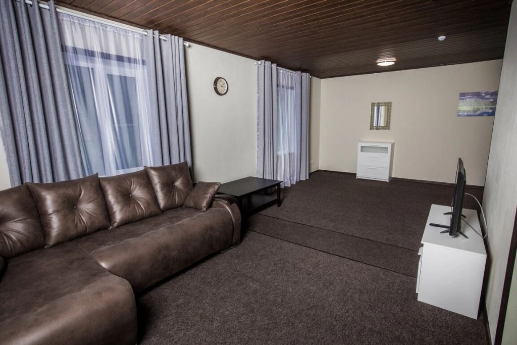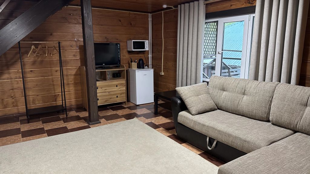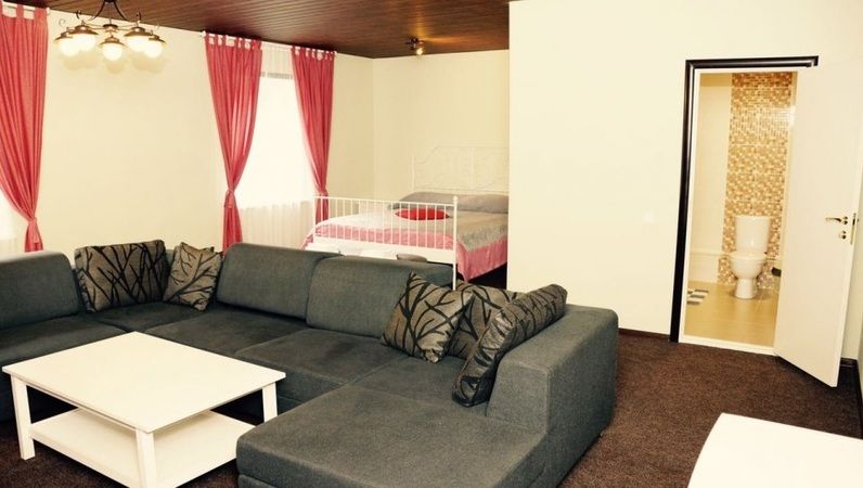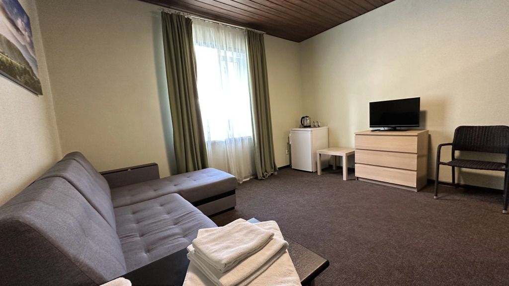 Просторный номер-студия площадью 46 м2 на трех человек. Большая туалетная комната с душем. Большая двуспальная кровать, диван с журнальным столиком, ТВ.