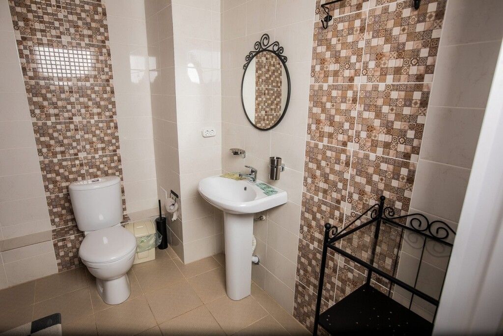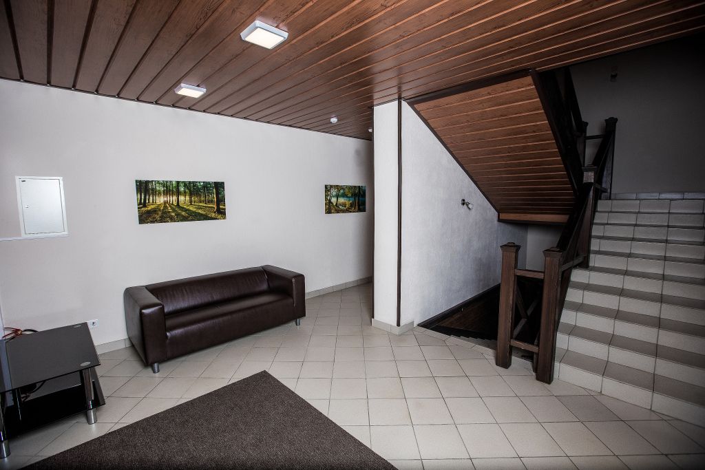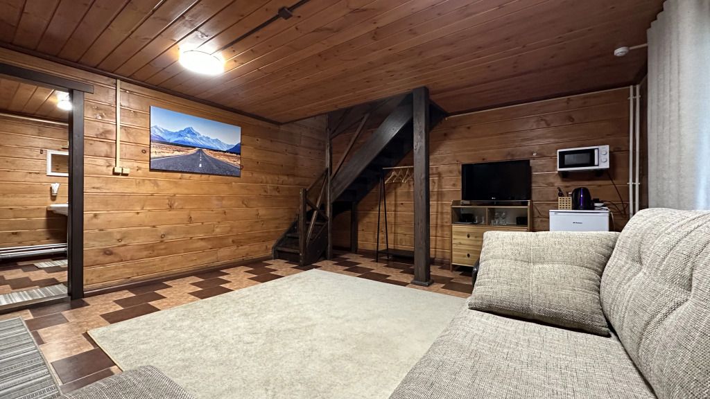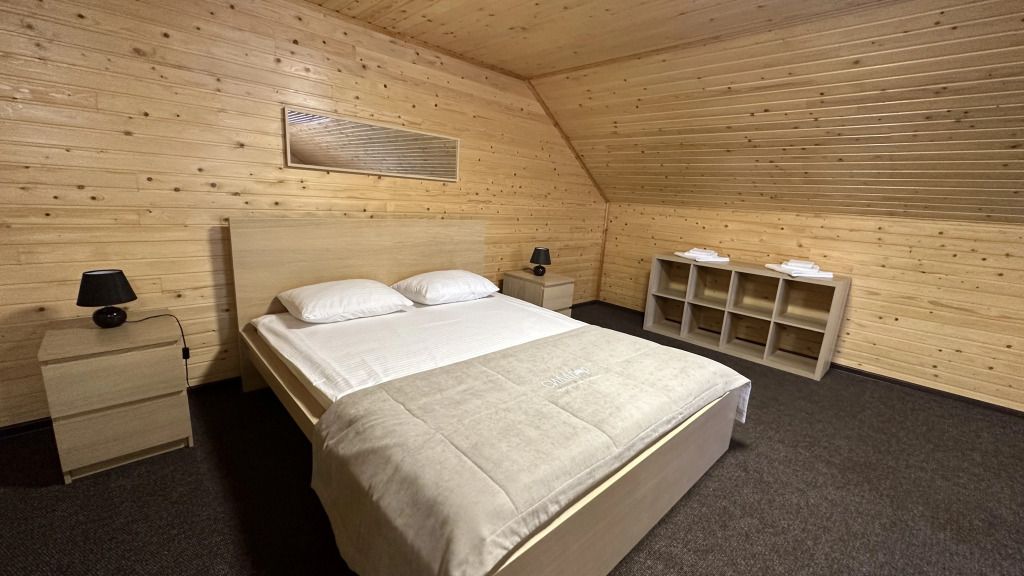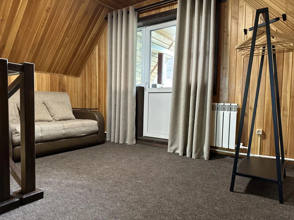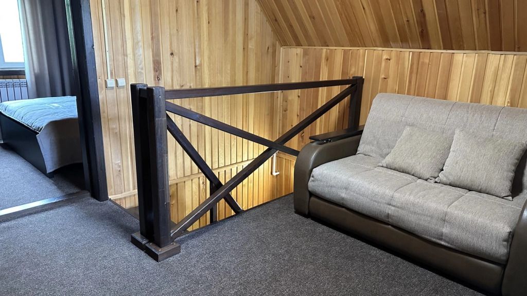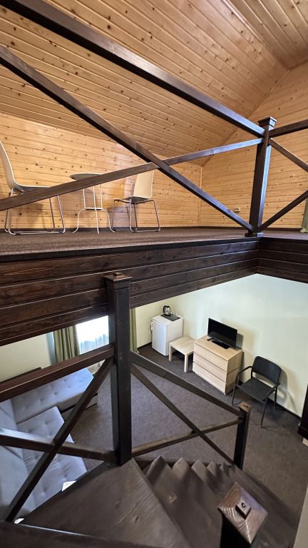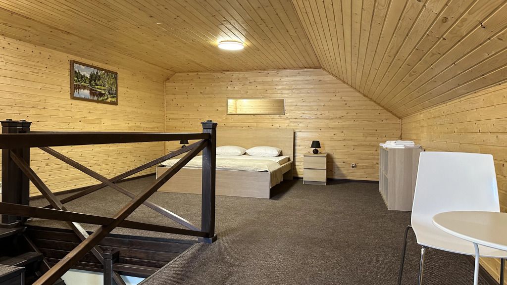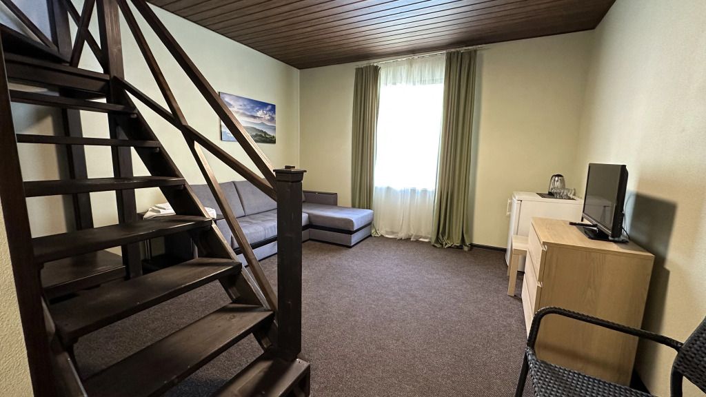 Двухэтажный номер площадью 40 м2 в гостинице. На первом этаже раскладывающийся диван, телевизор, сан. узел с душем. На втором этаже двуспальная кровать, сан. узел без душа.