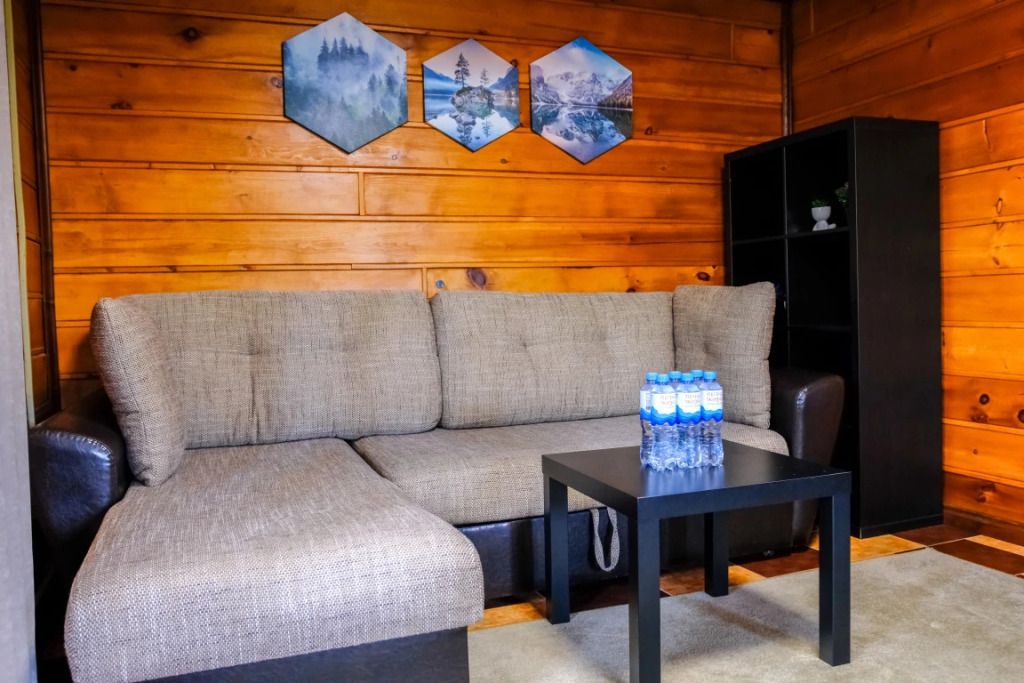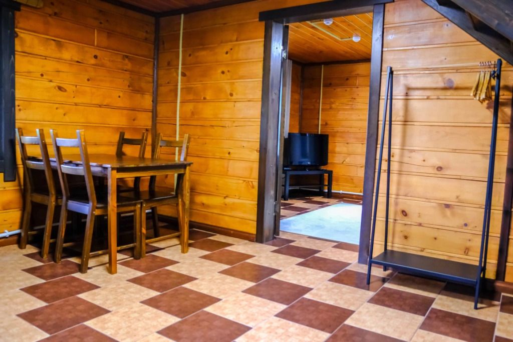 На 2-ом этаже — две двуспальные кровати, на 1-ом — раскладывающийся диван. Евро-раскладушка на доп месте. Удобства — ТВ, кухня с микроволновоью печью и чайником, необходимой посудой, душ, полотенца.