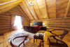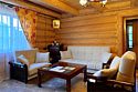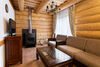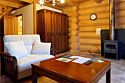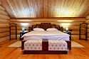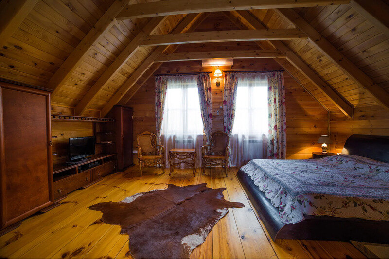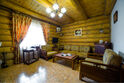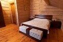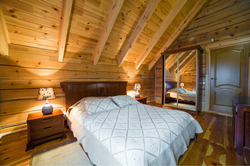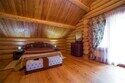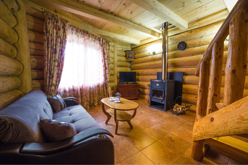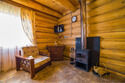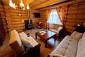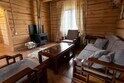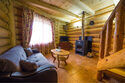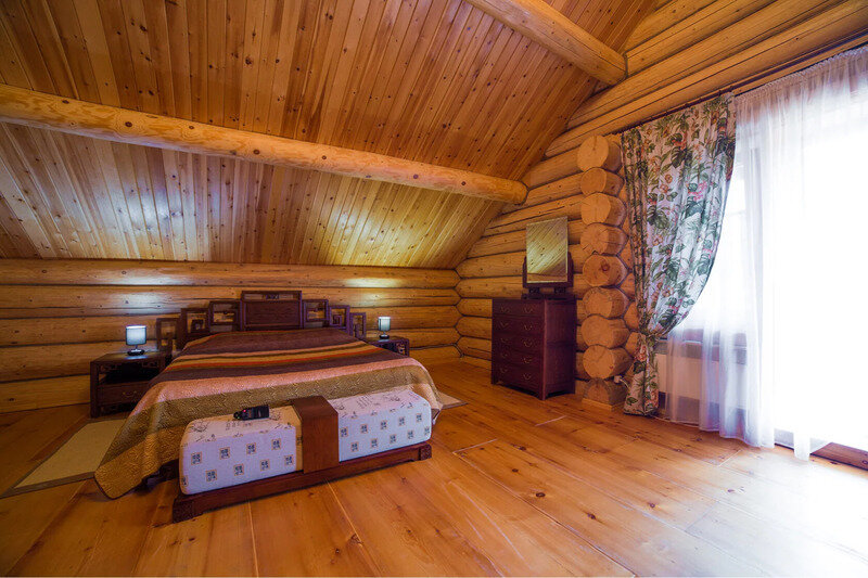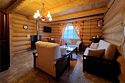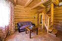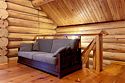 Двухэтажный коттедж из хвойных пород дерева. На первом этаже гостиная с мягкой зоной отдыха. На втором этаже уютная спальня.