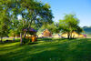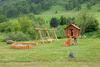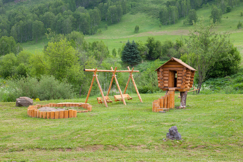 Для детей оборудована специальная площадка с качелями, избушкой на курьих ножках и небольшой крепостью.