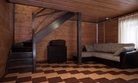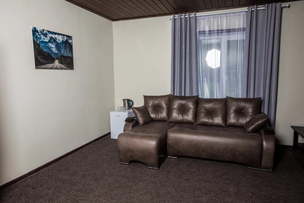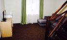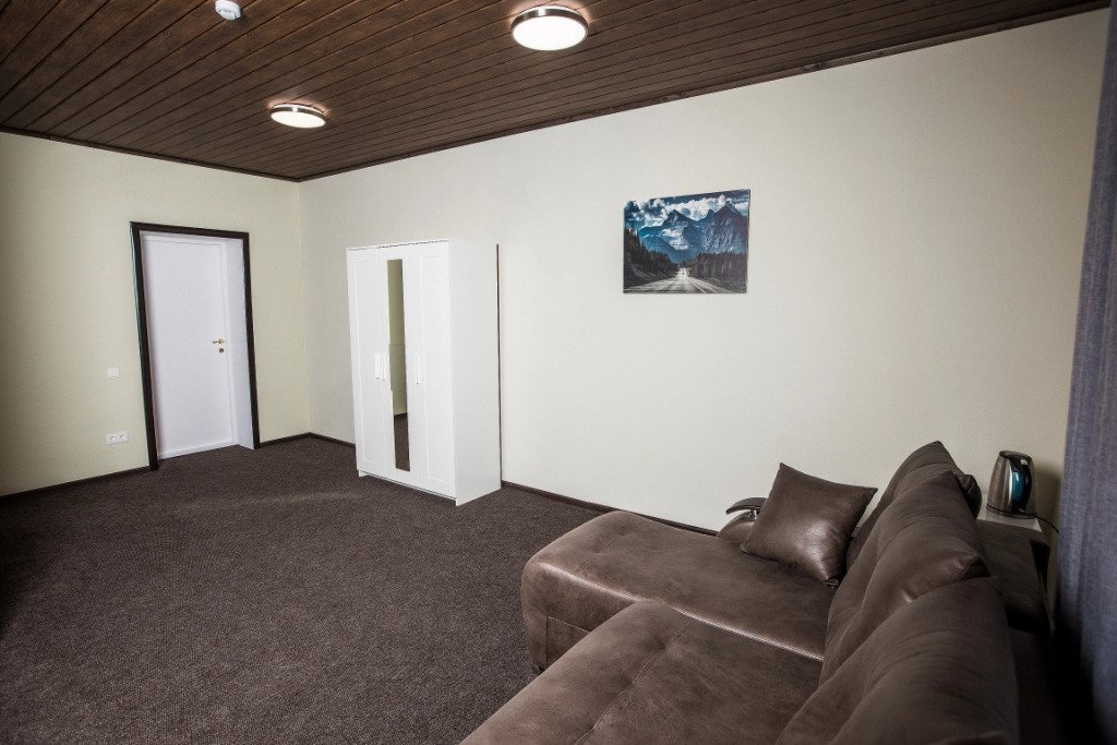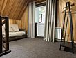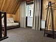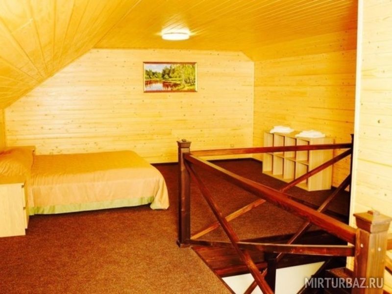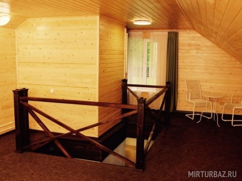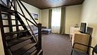 Двухэтажный номер площадью 40 м2 в гостинице. На первом этаже раскладывающийся диван, телевизор, сан. узел с душем. На втором этаже двуспальная кровать, сан. узел без душа.